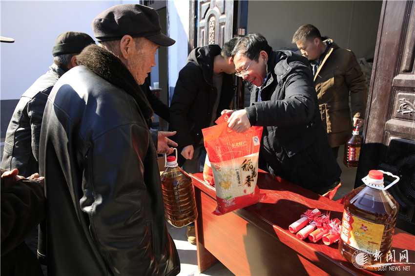 隨后,姚書志一行為全村180戶鄉(xiāng)親們集中發(fā)放了包括一袋10公斤大米、一袋10公斤面粉、一桶5升食用油、一副由我校教職工們書寫的春聯(lián)等的慰問品,并祝愿大家過上一個(gè)祥和愉快的春節(jié)。
