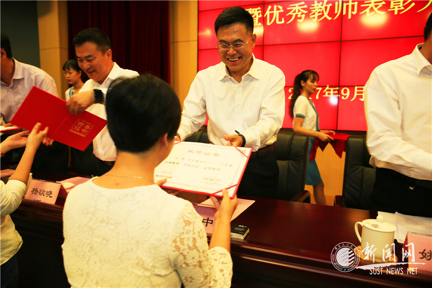校領(lǐng)導(dǎo)向2016年度優(yōu)秀教師及先進工作者頒發(fā)榮譽證書,向從教滿三十年榮譽教師頒發(fā)紀(jì)念獎杯;大學(xué)生代表們向在2016-2017學(xué)年獲得突出業(yè)績的優(yōu)秀教職工代表送上表達(dá)祝福和感謝的鮮花。