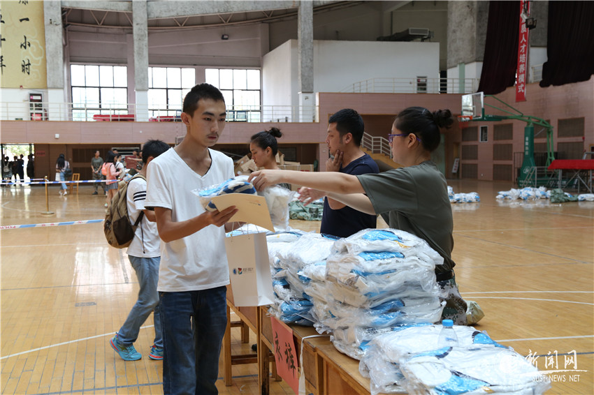 在迎新大道上,校領(lǐng)導(dǎo)一行先后來到各學(xué)院(部)迎新點一一慰問。每到一處,姚校長都會關(guān)切地詢問:“報了多少人了?”、“手續(xù)辦理快不快,需不需要排隊?”,并了解暑假期間有關(guān)學(xué)院開展的專業(yè)認證、評估等工作情況,同時不忘殷殷叮囑工作人員和學(xué)生志愿者:“天比較熱,大家要注意身體?!痹谖捏w館的服裝發(fā)放點,姚校長戴上要發(fā)給新生的印有?;盏拿弊樱惺芰艘幌率孢m度;又摸摸新生即將在軍訓(xùn)中穿的迷彩短袖,點點頭:“在這個天氣,穿這個比較涼快。”