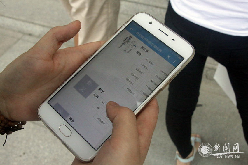 位于文體館發(fā)放軍訓(xùn)服點,來自設(shè)計與藝術(shù)學(xué)院的新生毛蕊給記者演示了她如何在易班上預(yù)訂服裝的過程:登陸易班、選擇自助報到頁面、進入服裝預(yù)訂系統(tǒng),即可提前網(wǎng)上選擇?!罢嬲媸欠奖阌挚旖莅。 泵镎f。