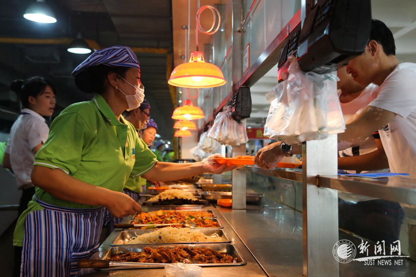 熱鬧的餐廳中,科大的“新鮮血液”們已經(jīng)到了他們的午餐時間,與家人一起在科大的餐廳中吃上來科大的第一頓飯,幸福的笑容寫在他們臉上。為保證新生和家長們順利、開心的用餐,飲食中心在三天前就開始了一系列準(zhǔn)備,而今天也是從早上五點就已經(jīng)開始了加工工作。并且今天開放了沁園一、二、清真、接待四個餐廳,并配備有兩名專職監(jiān)督員,監(jiān)控飲食安全與衛(wèi)生,為新生的飲食健康保駕護航。