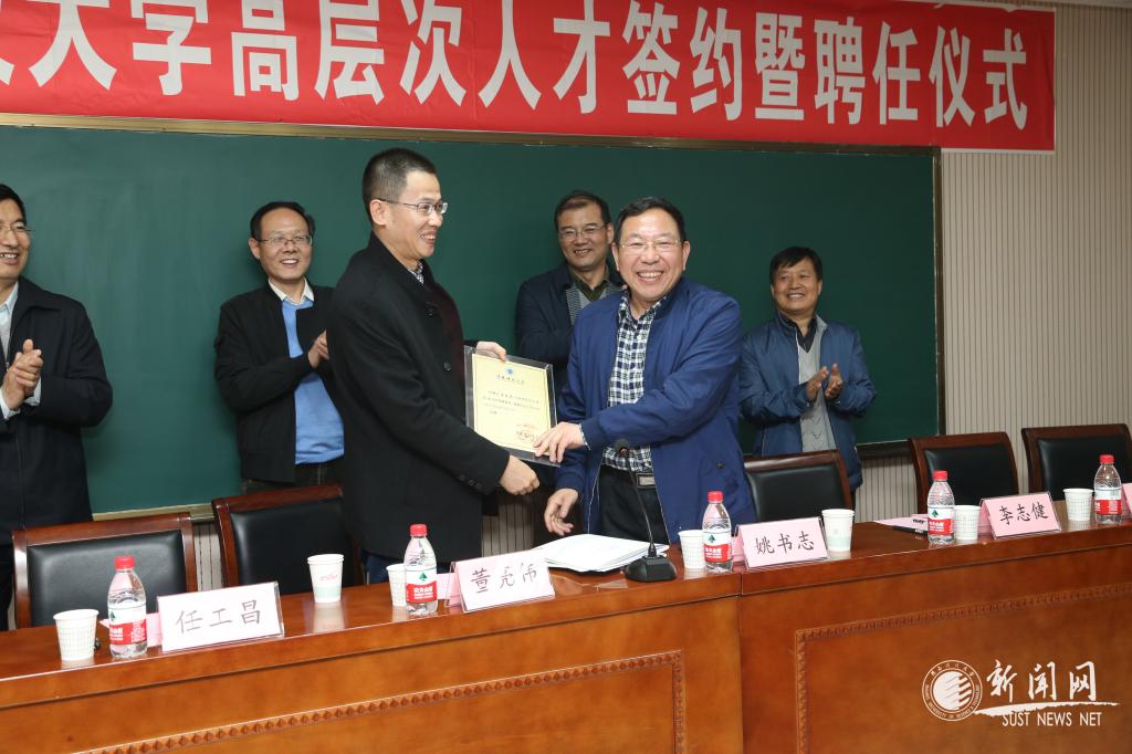 姚書志代表學(xué)校與董亮偉教授簽訂高層次人才聘任協(xié)議書并頒發(fā)聘書。他要求文理學(xué)院及有關(guān)職能部門創(chuàng)造優(yōu)質(zhì)條件,讓特聘教授能安心工作、開心工作。希望董亮偉發(fā)揮自身優(yōu)勢(shì),組建高水平的創(chuàng)新團(tuán)隊(duì),積極開展科學(xué)研究,為我校學(xué)科建設(shè)和學(xué)科評(píng)估貢獻(xiàn)力量。