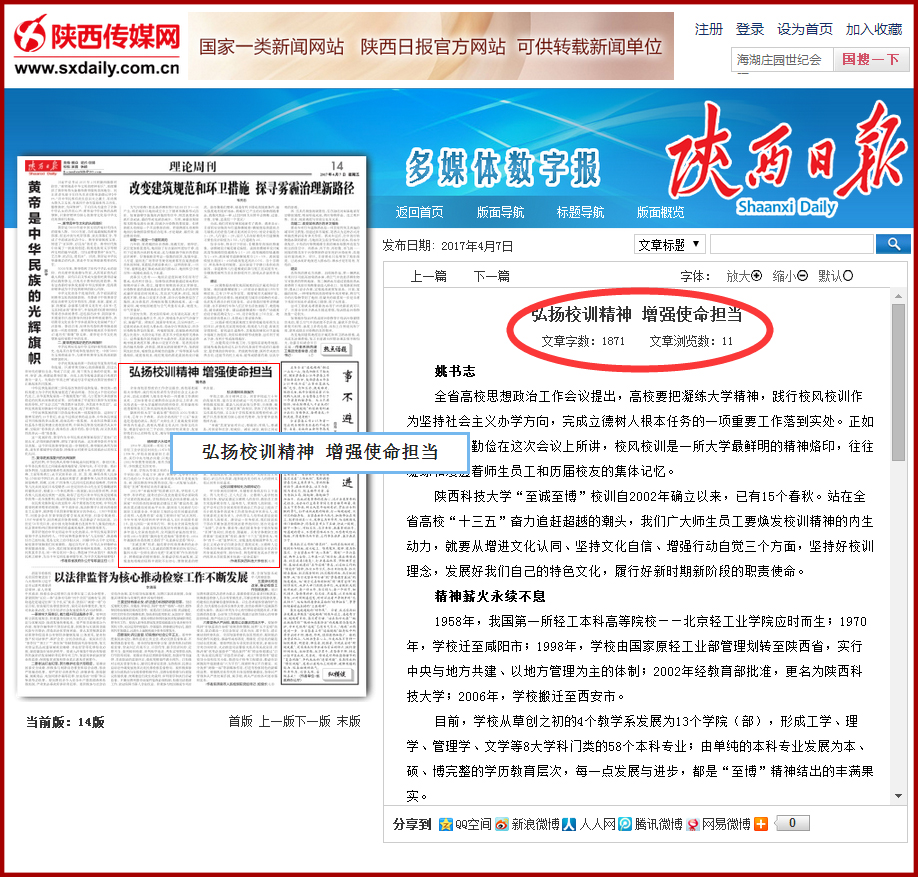 《陜西日?qǐng)?bào)》4月7日《理論周刊》版刊發(fā)了我校校長(zhǎng)姚書志的署名文章《弘揚(yáng)校訓(xùn)精神 增強(qiáng)使命擔(dān)當(dāng)》,全文轉(zhuǎn)載如下: