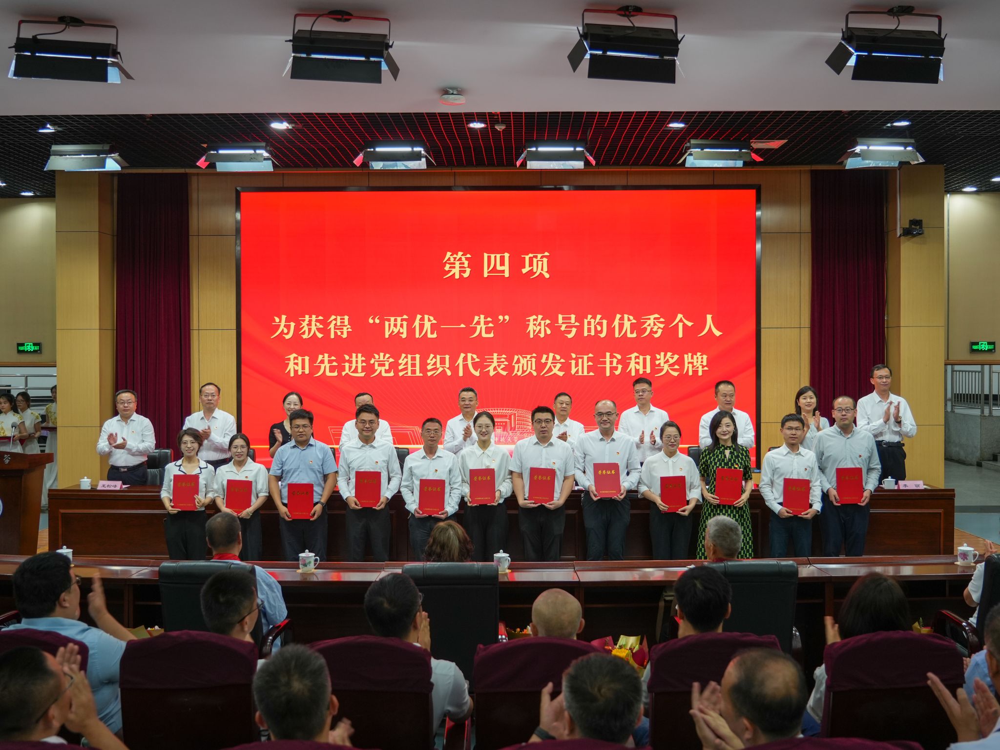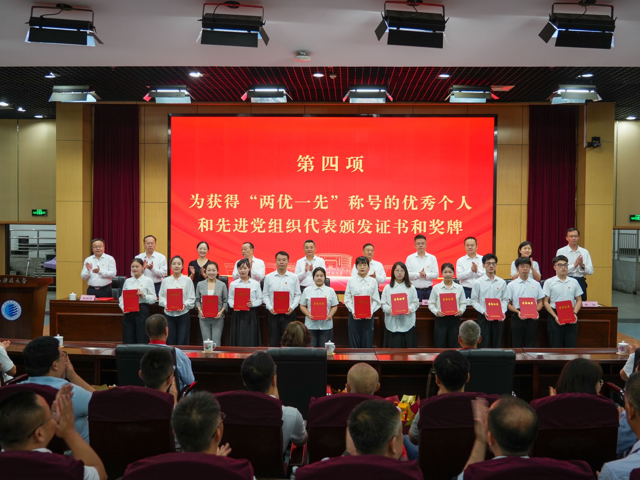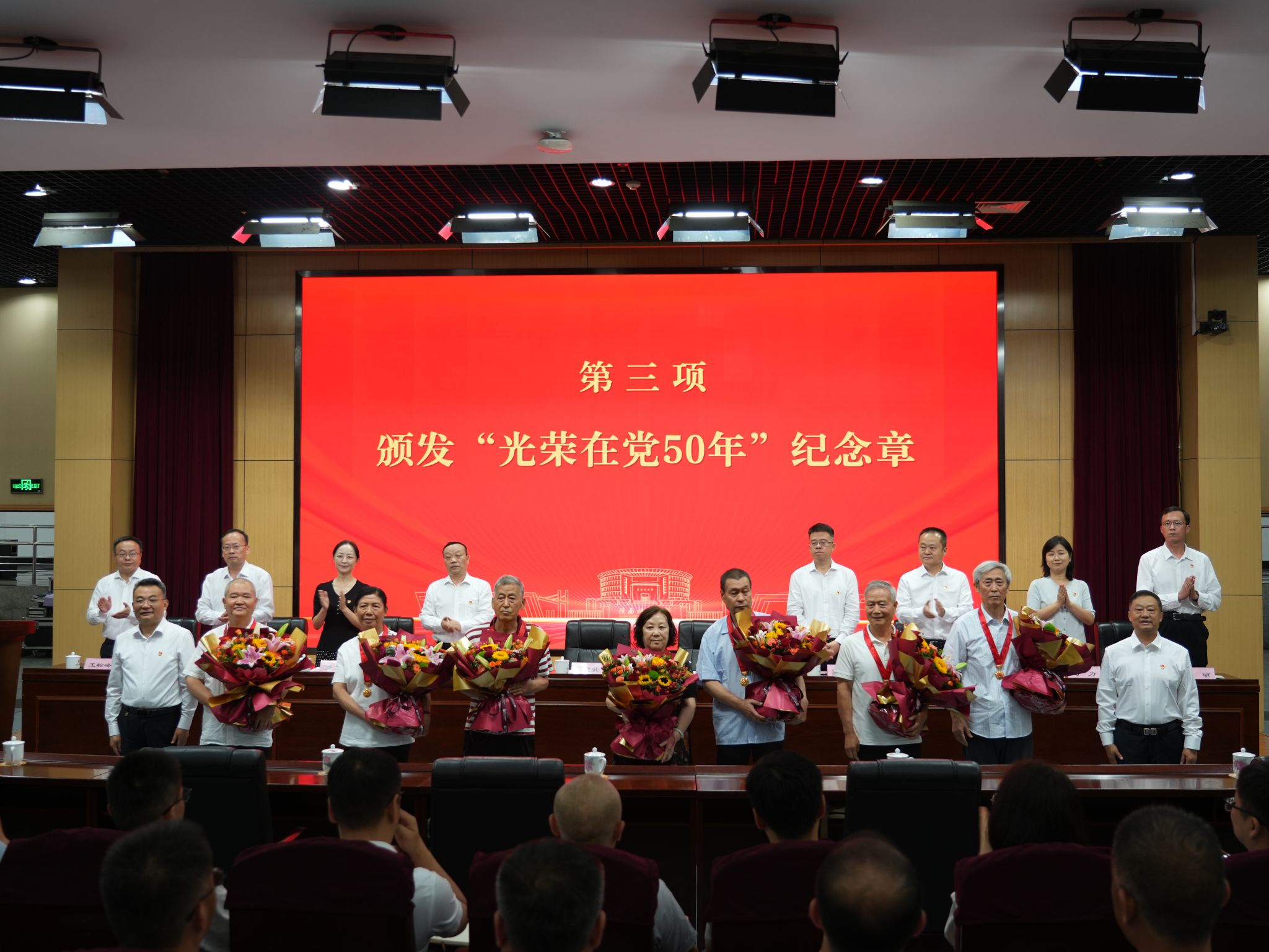 大會在莊嚴的國歌聲中拉開帷幕。黨委副書記王道安宣讀“光榮在黨50年”紀念章人員名單和“兩優(yōu)一先”表彰決定。樊建武、黃劍鋒為“光榮在黨50年”黨員代表頒發(fā)紀念章,受表彰的“兩優(yōu)一先”代表依次上臺領(lǐng)取了證書和獎牌。