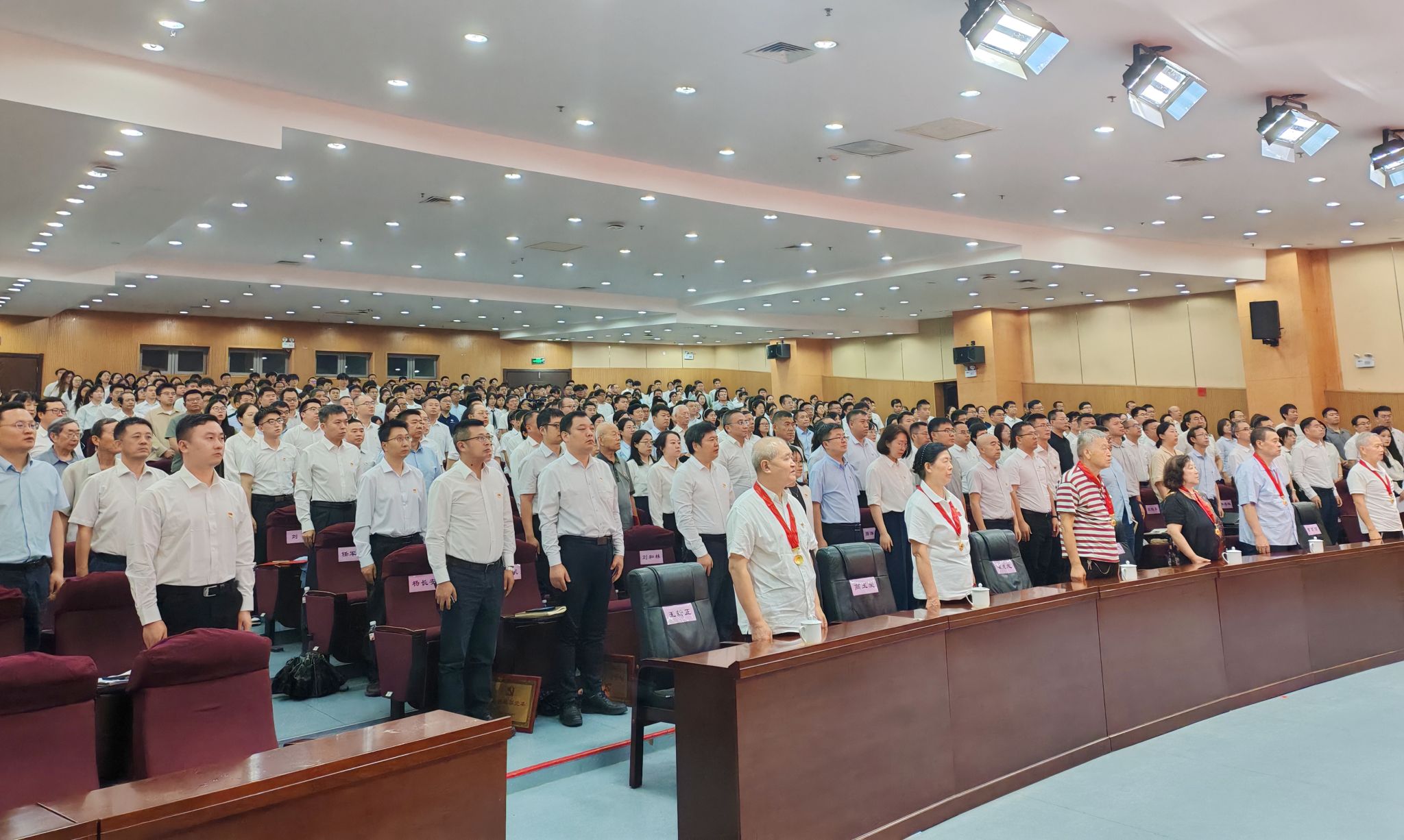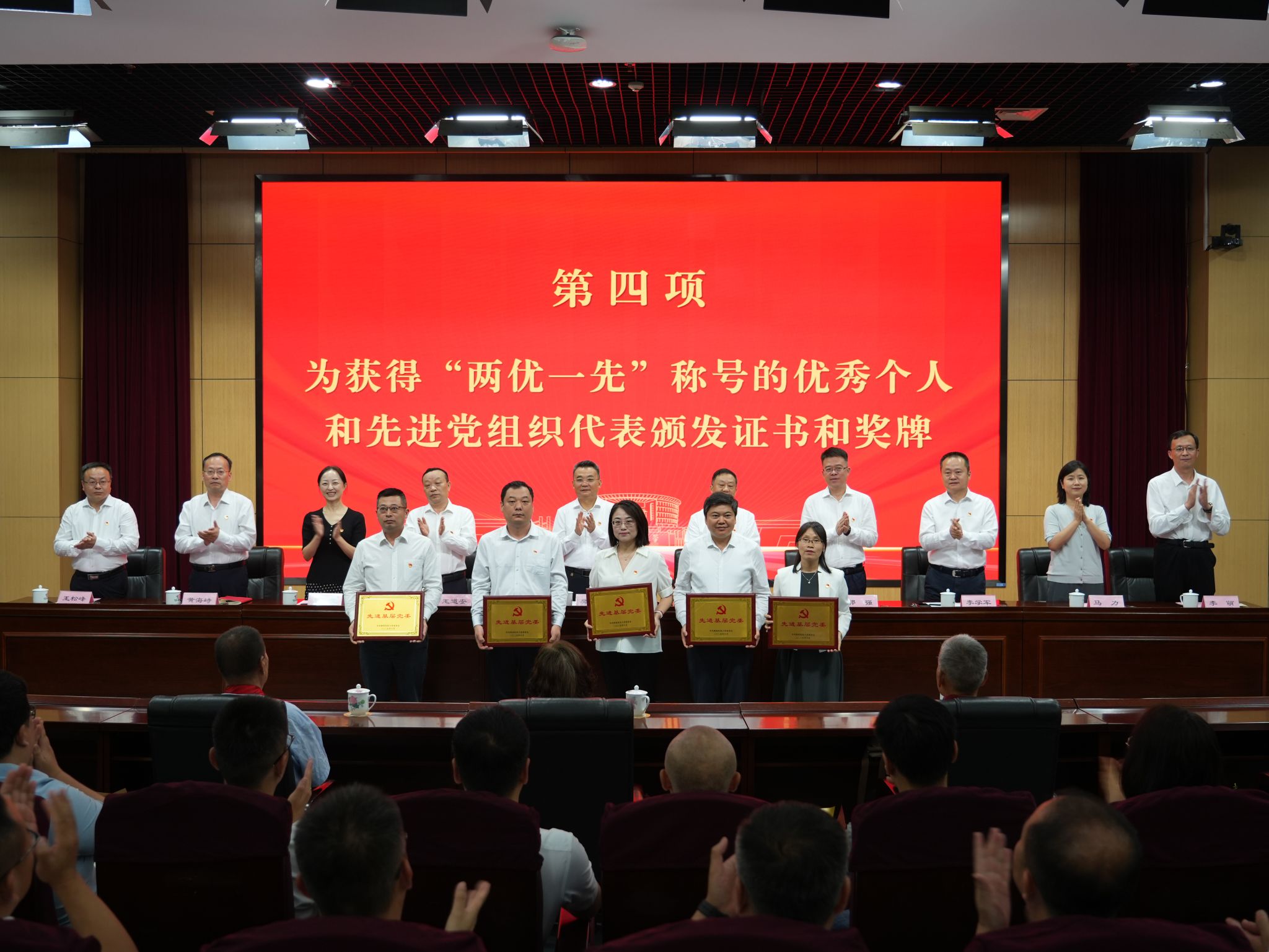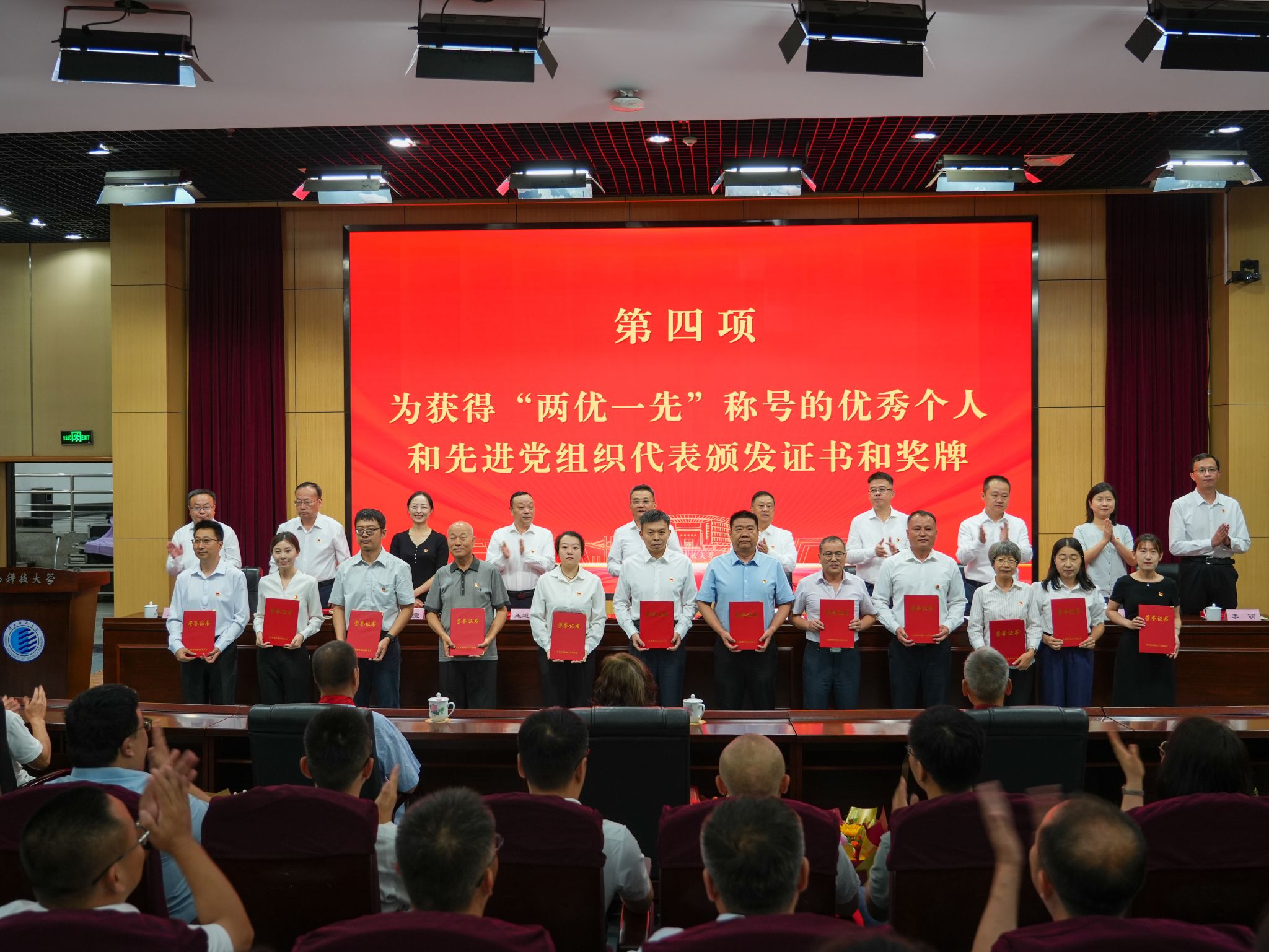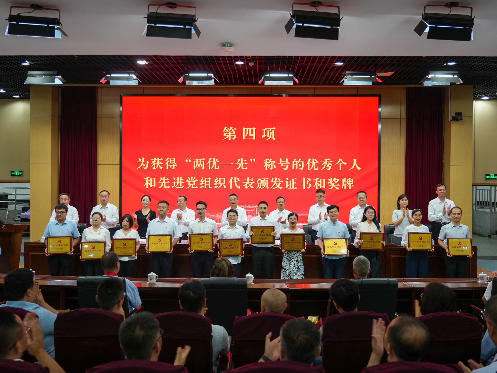 大會在莊嚴的國歌聲中拉開帷幕。黨委副書記王道安宣讀“光榮在黨50年”紀念章人員名單和“兩優(yōu)一先”表彰決定。樊建武、黃劍鋒為“光榮在黨50年”黨員代表頒發(fā)紀念章,受表彰的“兩優(yōu)一先”代表依次上臺領(lǐng)取了證書和獎牌。