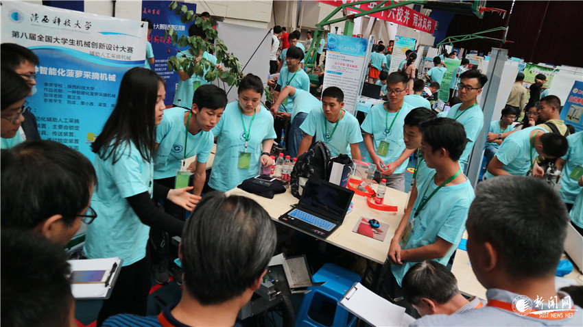 評(píng)委對(duì)我校作品“一種智能化菠蘿采摘機(jī)械”進(jìn)行現(xiàn)場(chǎng)問(wèn)辯