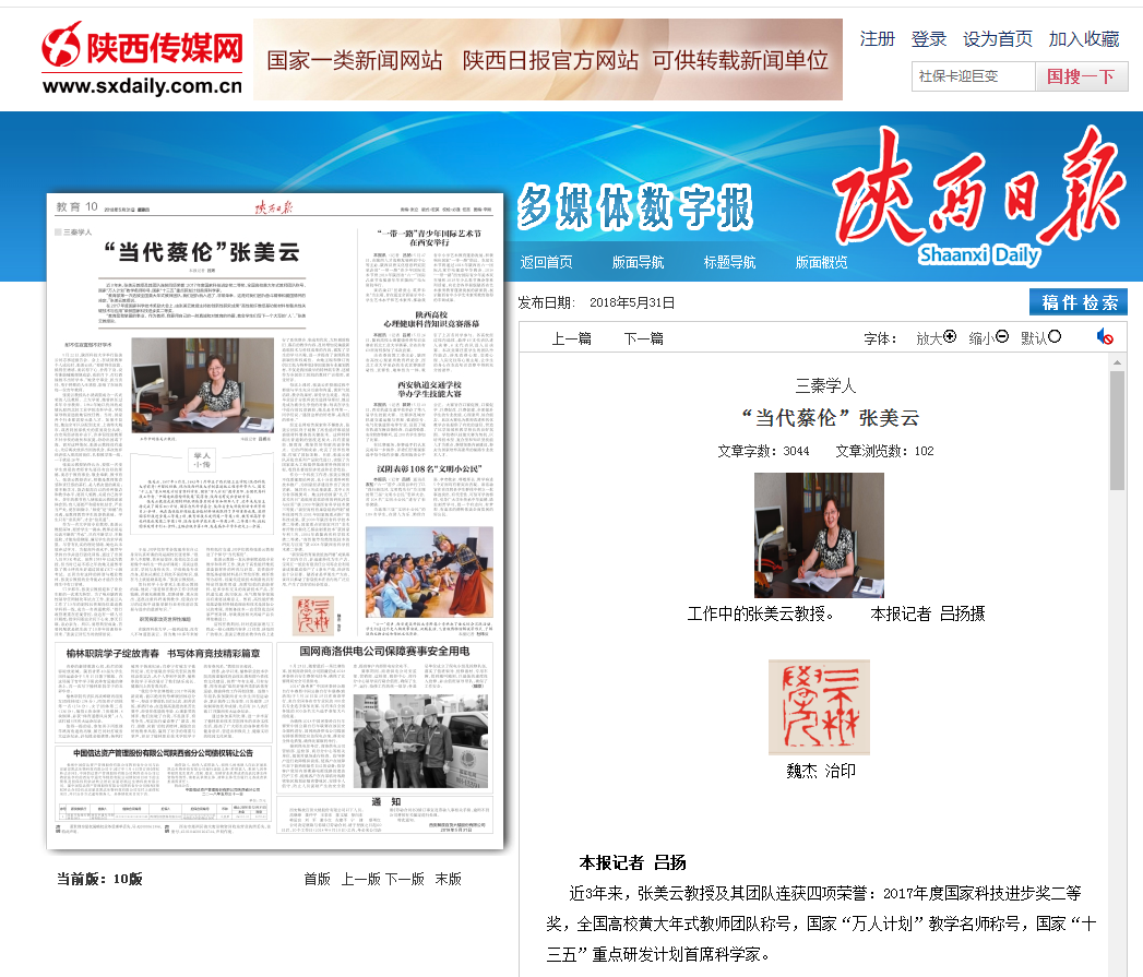 5月31日,《陜西日報(bào)》教育版以《三秦學(xué)人 “當(dāng)代蔡倫”張美云》為題報(bào)道了我校張美云教授的教學(xué)科研事跡,全文轉(zhuǎn)載如下: