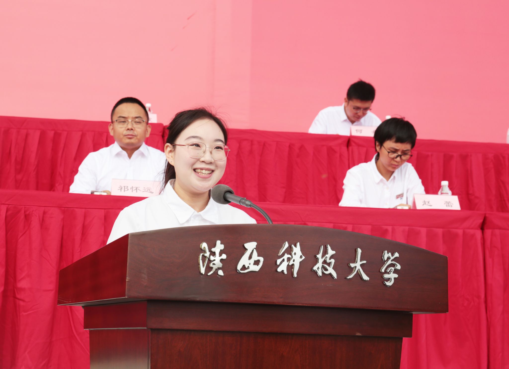 設(shè)計(jì)與藝術(shù)學(xué)院研2024級(jí)肖曌霞同學(xué)作為在校生代表分享了個(gè)人成長(zhǎng)經(jīng)歷,號(hào)召全體新生要高舉理想火炬,扛起時(shí)代責(zé)任,磨礪堅(jiān)韌品格,做有理想、敢擔(dān)當(dāng)、能吃苦、肯奮斗的新時(shí)代科大好青年。