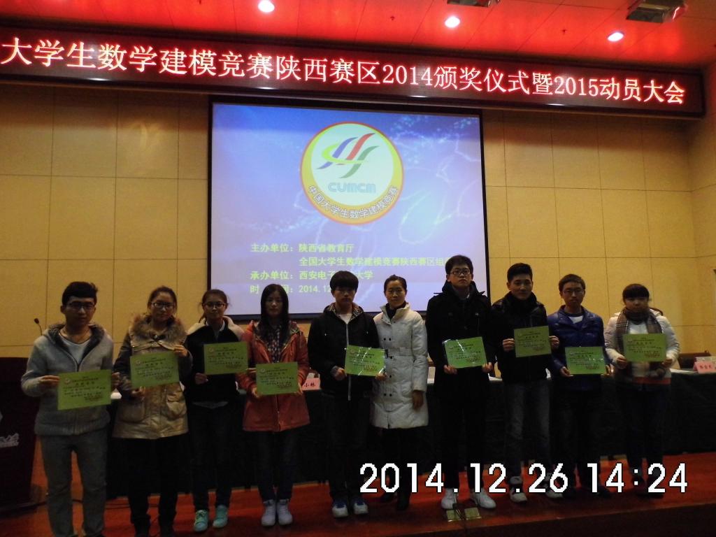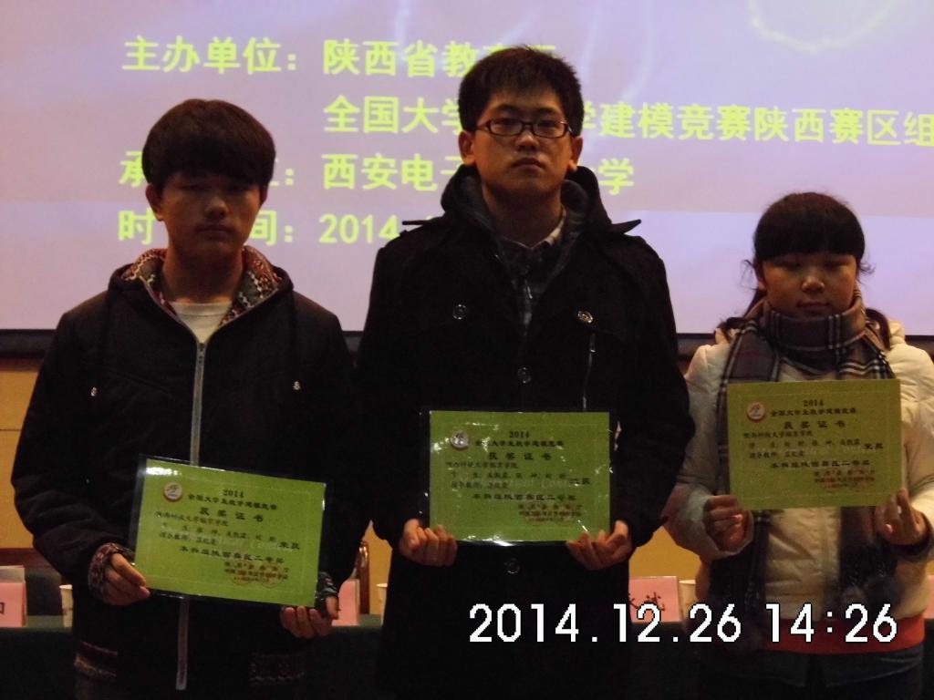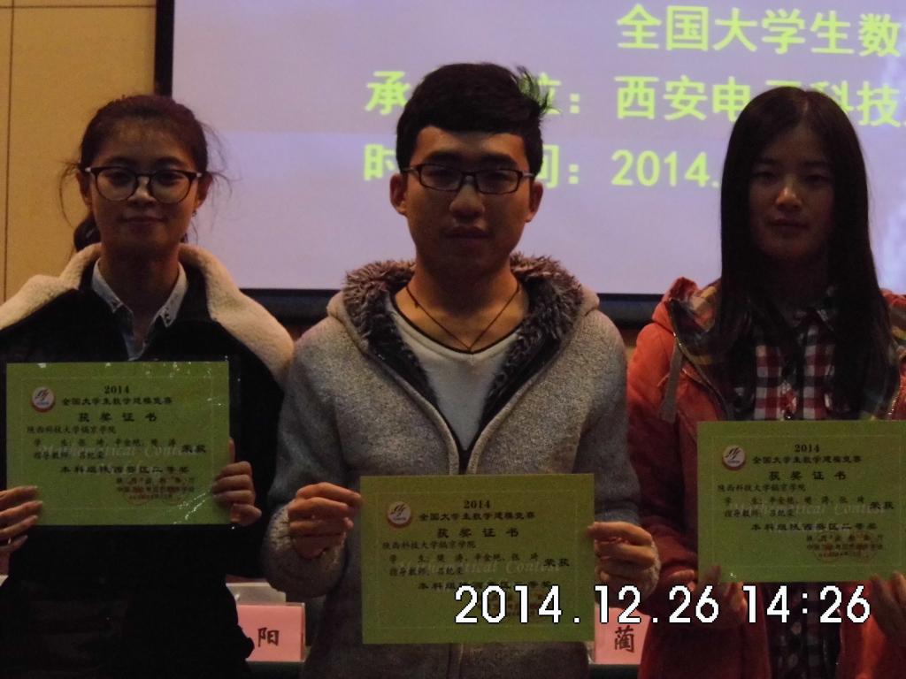 2014年學(xué)院首次組織學(xué)生參加全國大學(xué)生數(shù)學(xué)建模競賽和數(shù)學(xué)競賽,隊(duì)員主要從高數(shù)基地班中選拔,共12名學(xué)生組成4支隊(duì)伍參加建模競賽,239名同學(xué)參加數(shù)學(xué)競賽,并統(tǒng)籌聘請陜西科技大學(xué)的優(yōu)秀建模教練組和學(xué)院的優(yōu)秀青年教師對參賽學(xué)生進(jìn)行暑期集中培訓(xùn)、輔導(dǎo)及后期強(qiáng)化訓(xùn)練。歷經(jīng)1個多月緊張學(xué)習(xí),同學(xué)們同心協(xié)力、團(tuán)結(jié)拼搏、不畏困難,最終取得了優(yōu)異的成績,為學(xué)院贏得了榮譽(yù)。