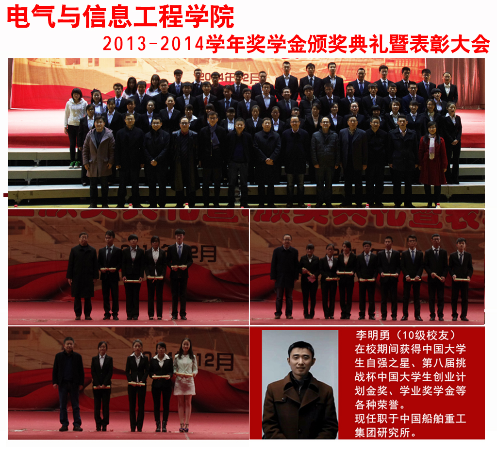 12月23日晚,電氣與信息工程學(xué)院2013-2014學(xué)年獎(jiǎng)學(xué)金頒獎(jiǎng)典禮暨表彰大會(huì)在文體館隆重舉行,此次典禮是電信學(xué)院自2010年以來第5年舉行。相比歷屆獎(jiǎng)學(xué)金頒獎(jiǎng)典禮,最大的特點(diǎn)是曾經(jīng)在舞臺(tái)上領(lǐng)過獎(jiǎng)的08、09、10級(jí)三屆共6名優(yōu)秀校友,不忘母校情,通過視頻對(duì)學(xué)生表達(dá)真情。
