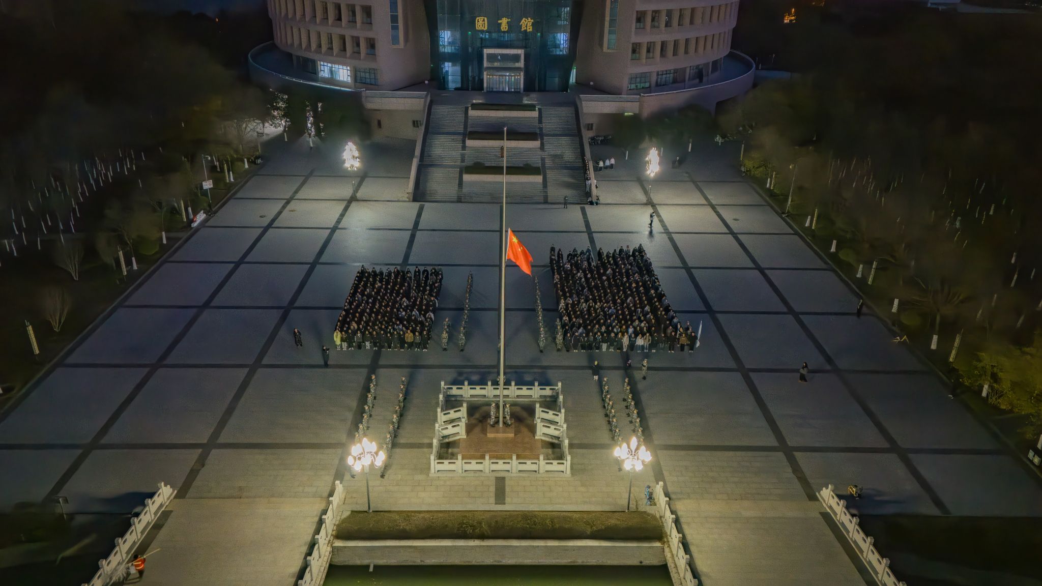 清晨七時,圖書館南廣場莊嚴肅穆。國旗護衛(wèi)隊隊員將國旗升起后又徐徐降下,為南京大屠殺死難同胞下半旗志哀,在場近五百名師生靜默肅立,向南京大屠殺死難者默哀。