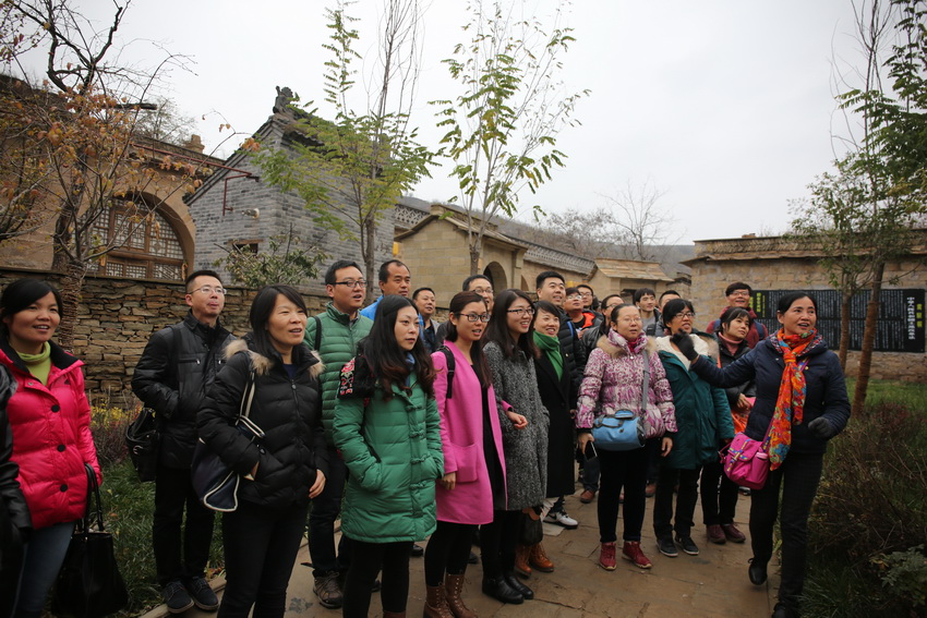 來到棗園革命舊址的時(shí)候,金燦燦的陽(yáng)光正照耀在革命英雄雕像前,遠(yuǎn)處的棗樹上還有未掉落的大紅棗,延安姑娘熱心地為大家唱起民歌——“大紅棗兒甜又香,送給咱親人嘗一嘗,一顆棗兒一顆心,心心向著共產(chǎn)黨”。走在延安城里,大家隨時(shí)都會(huì)被人民群眾的淳樸與熱情所感染,作為革命圣地,這里的人民與黨和軍隊(duì)有著濃得化不開的深情,每到一處革命舊址,老鄉(xiāng)就會(huì)熱情地為大家唱一段,“騎白馬,跨洋槍,三哥哥吃的是八路軍的糧”,“山丹丹開花紅艷艷,咱中央紅軍到陜北”,“羊肚子那個(gè)毛巾喲三道道藍(lán),紅軍哥哥跟的是劉志丹”。那種充滿了革命樂觀主義精神的熱情與高亢,讓人滿懷振奮與激昂。在文安驛古鎮(zhèn)上的歌譜碑前,青年教師們也情不自禁地唱起了《東方紅》:“東方紅,太陽(yáng)升,中國(guó)出了個(gè)毛澤東...”那是從內(nèi)心汩汩流出的聲音,是發(fā)自內(nèi)心對(duì)毛澤東思想、對(duì)革命精神的崇敬。