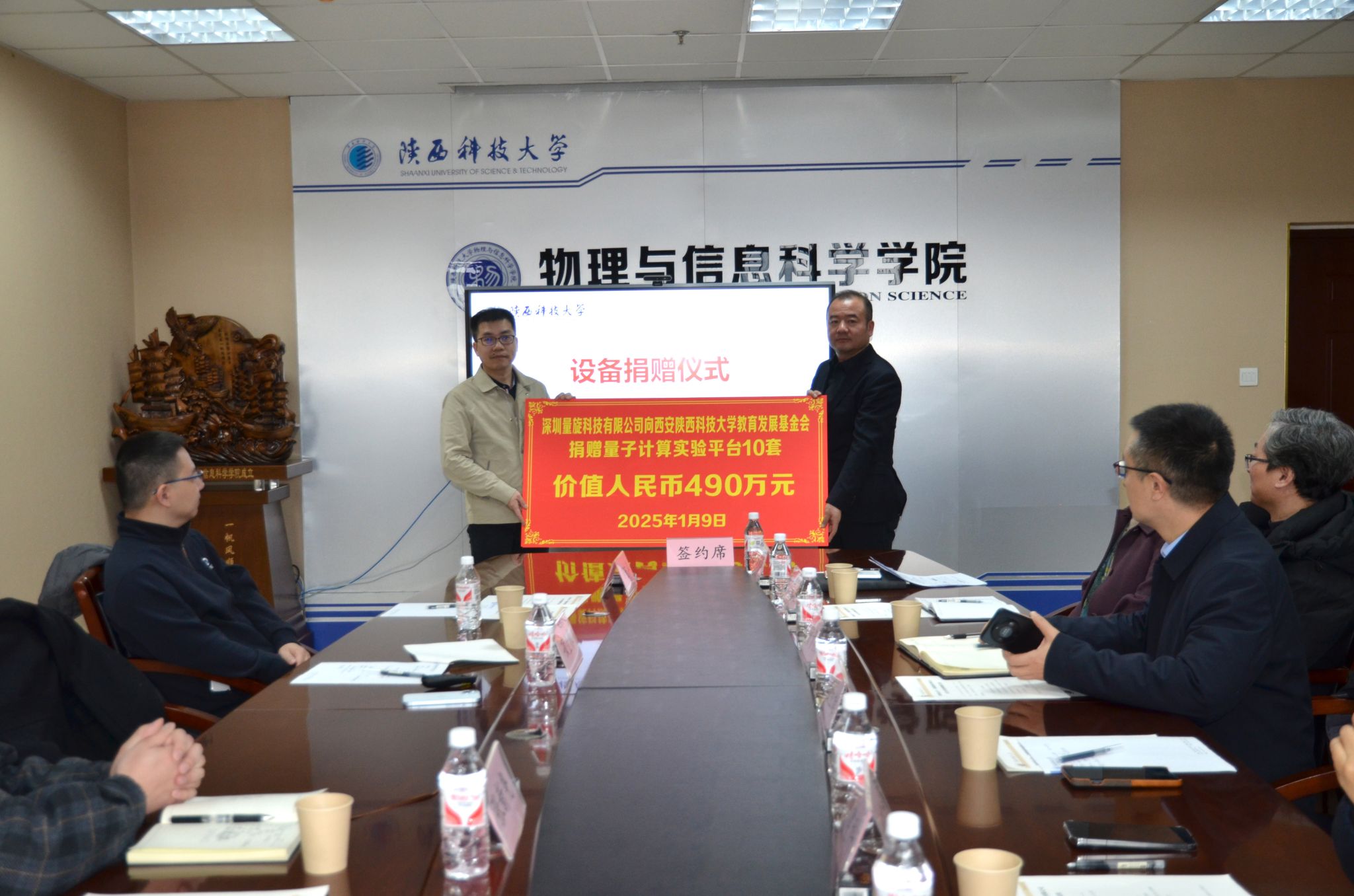 1月9日,陜西科技大學(xué)與深圳量旋科技有限公司產(chǎn)學(xué)研合作簽約暨捐贈儀式在物理學(xué)院舉行。深圳量旋科技有限公司總裁項金根、副總裁鄒宏洋、區(qū)域銷售總監(jiān)張新堯,陜西科技大學(xué)副校長費貴強(qiáng)、教育發(fā)展基金會理事長殷立雄、實驗室與設(shè)備管理處處長代春吉以及物理學(xué)院班子成員、師生代表參加儀式。深圳量旋科技有限公司向陜西科技大學(xué)捐贈價值490萬元人民幣的量子計算實驗平臺10套。物理學(xué)院黨委書記陳源梅主持簽約儀式。