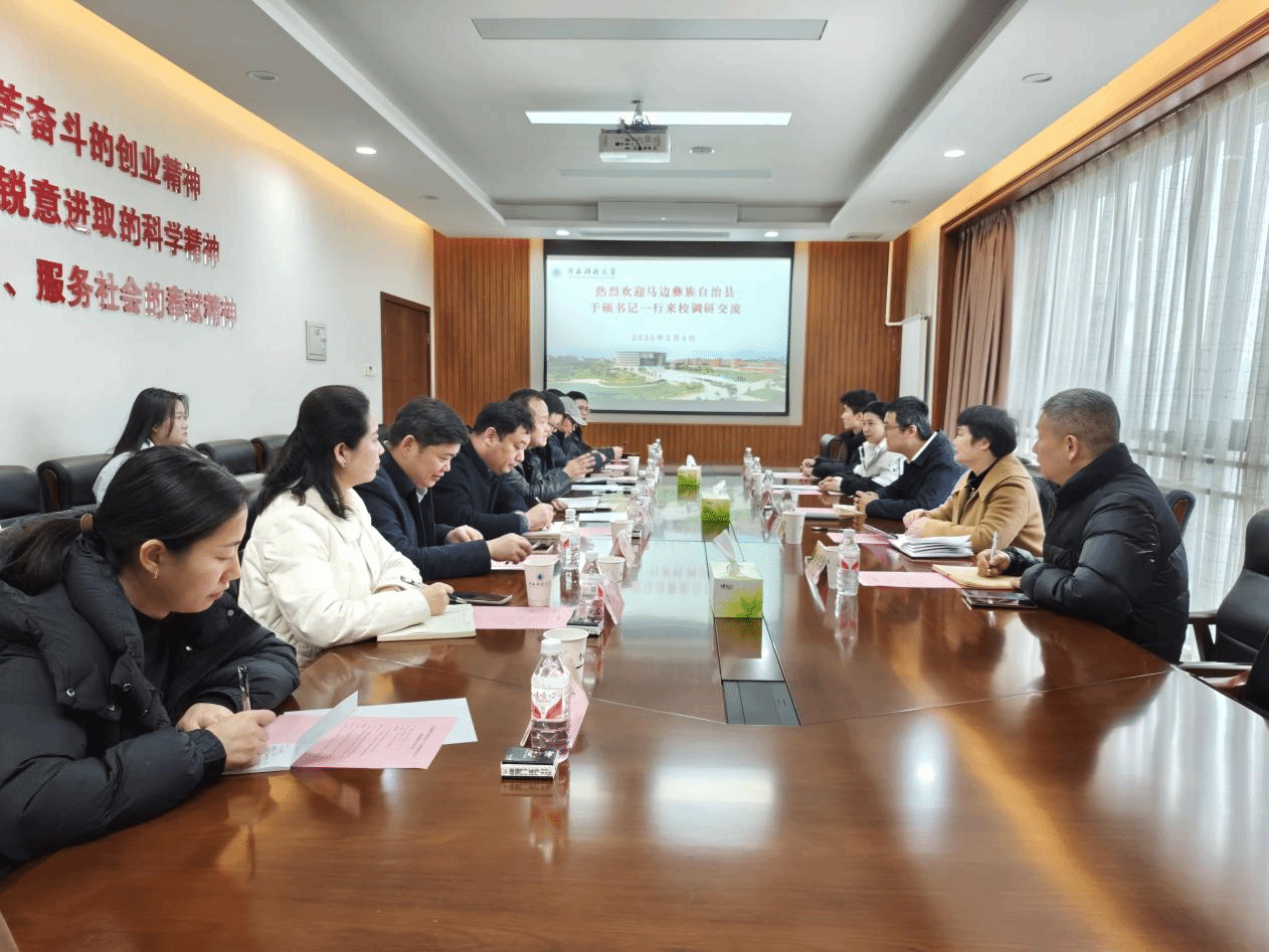 李學(xué)軍對于碩一行表示歡迎,簡要介紹了學(xué)校的發(fā)展歷程、學(xué)科建設(shè)、人才引育等情況。他表示,雙方在教育、科研、產(chǎn)業(yè)等多領(lǐng)域可開展深度融合,希望通過此次交流促使校地合作高質(zhì)量發(fā)展邁向新階段,為馬邊縣持續(xù)鞏固脫貧攻堅成果貢獻(xiàn)力量。