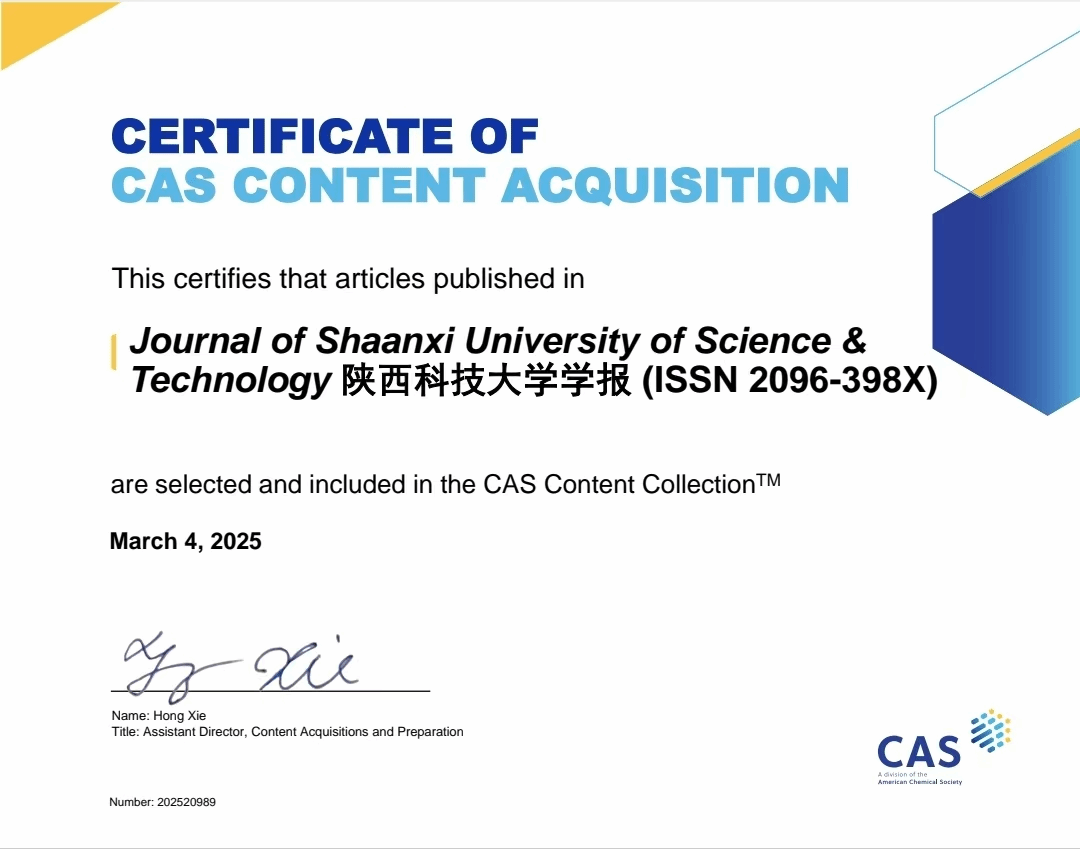 2025年3月4日,《陜西科技大學(xué)學(xué)報(bào)》在經(jīng)過前期申報(bào)及美國(guó)化學(xué)文摘社(Chemical Abstracts Service,CAS)的多輪嚴(yán)格評(píng)估后,最終被全球權(quán)威數(shù)據(jù)庫(kù)美國(guó)化學(xué)文摘(Chemical Abstracts, CA)正式收錄。這是本刊繼被《俄羅斯文摘雜志》(AJ)、《英國(guó)食品科技文摘》(FSTA)、《美國(guó)艾博思科全文數(shù)據(jù)庫(kù)》(EBSCOhost)、《美國(guó)烏利希國(guó)際期刊指南》(UPD)等大型國(guó)際數(shù)據(jù)庫(kù)收錄后,再次被國(guó)際知名數(shù)據(jù)庫(kù)收錄。將進(jìn)一步提升《陜西科技大學(xué)學(xué)報(bào)》的期刊國(guó)際影響力,拓寬加深學(xué)報(bào)論文的國(guó)際傳播廣度和深度。