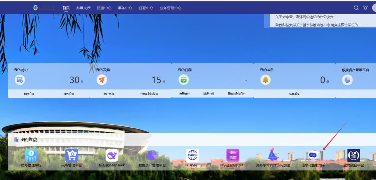 我校師生登陸學(xué)校綜合門戶,在首頁(yè)點(diǎn)擊“信息化智能助手”圖標(biāo)即可使用