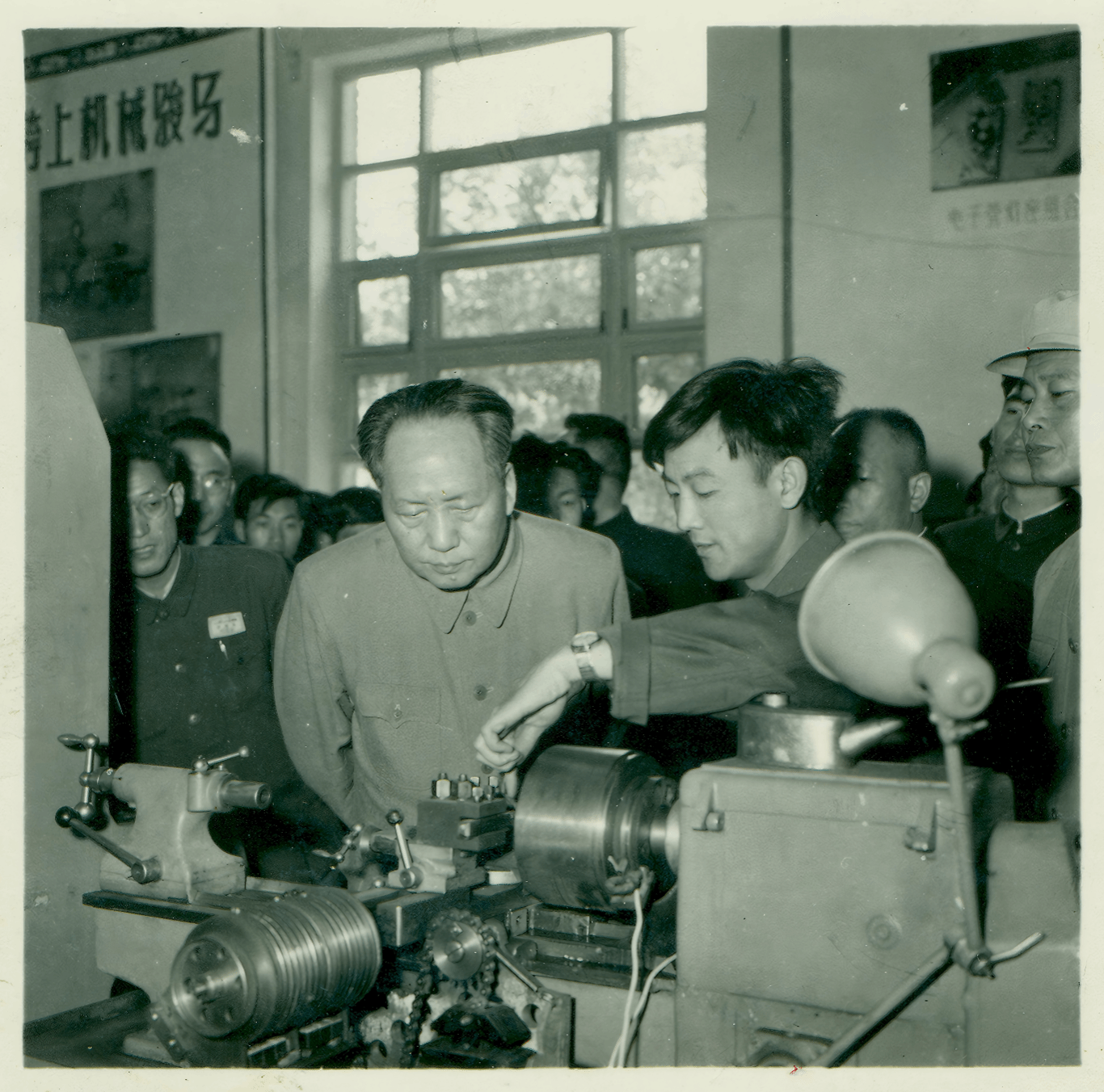 1960年5月1日,毛主席在河北省工業(yè)交通運(yùn)輸基本建設(shè)技術(shù)革命展覽會(huì)上觀(guān)看鐘顯賀的機(jī)床演示操作匯報(bào)