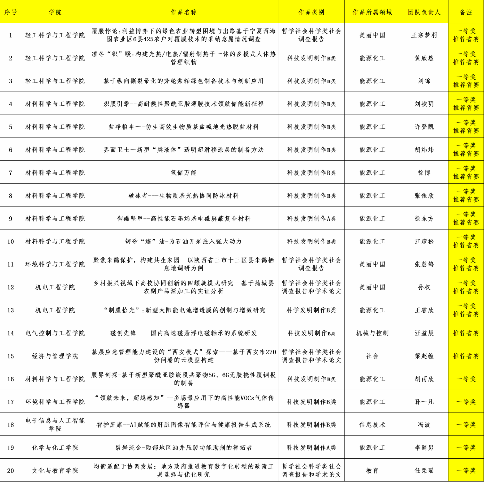 附:陜西科技大學(xué)第十七屆“復(fù)興杯”大學(xué)生課外學(xué)術(shù)作品競賽一等獎及推薦省賽項目名單
