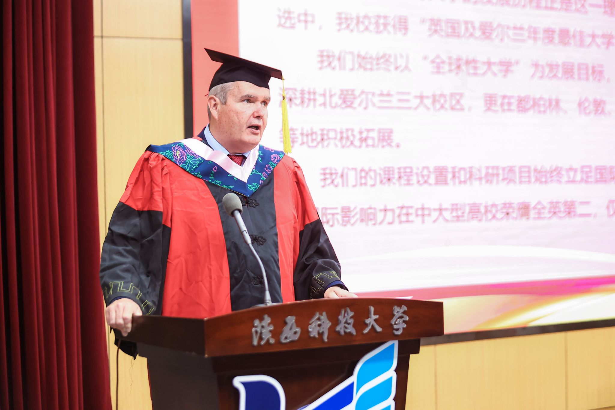 Christopher Wigginton在致辭中對陜西科技大學在中外合作辦學事業(yè)發(fā)展中給予的支持表示感謝,并向2025屆畢業(yè)生圓滿完成學業(yè)表示祝賀。他寄語畢業(yè)生要秉持合作精神,加入全球校友網絡,以全球視野規(guī)劃職業(yè)生涯,攜手為推動世界經濟社會發(fā)展作出貢獻。