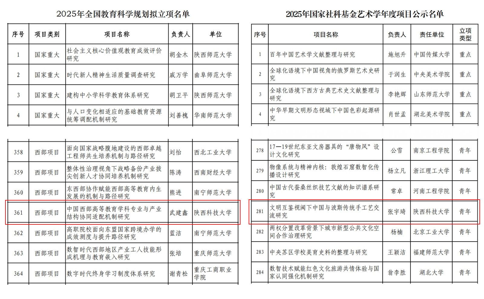 人文社科領(lǐng)域多點(diǎn)突破,高層次項(xiàng)目取得新進(jìn)展。在人文社科領(lǐng)域,學(xué)校重點(diǎn)推進(jìn)國家級、省級項(xiàng)目申報(bào)與成果培育。其中,張宇琦博士的《文明互鑒視閾下中國與波斯傳統(tǒng)手工藝交流研究》獲批國家社科基金藝術(shù)學(xué)年度項(xiàng)目公示;武建鑫教授在2025年國家社科基金(教育學(xué))評審中成功立項(xiàng),成為陜西省屬高校僅有的3項(xiàng)立項(xiàng)之一。此外,學(xué)校組織24項(xiàng)成果申報(bào)陜西省第十七次哲學(xué)社會科學(xué)優(yōu)秀成果獎(jiǎng),推薦6位專家參選習(xí)近平文化思想研究中心陜西協(xié)同研究基地專家?guī)?,并完?5項(xiàng)陜西省文化和旅游課題申報(bào),人文社科影響力持續(xù)提升。