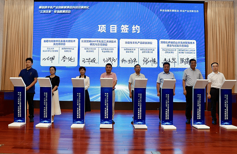在渭南市,食品學(xué)院深度對(duì)接當(dāng)?shù)匮蛉楫a(chǎn)業(yè)優(yōu)勢(shì),積極參與秦創(chuàng)原羊乳產(chǎn)業(yè)創(chuàng)新聚集區(qū)科技成果路演,并與重點(diǎn)龍頭企業(yè)紅星美羚乳業(yè)股份有限公司就“功能性羊乳產(chǎn)品研發(fā)”項(xiàng)目成功簽約,共同推進(jìn)高附加值、健康導(dǎo)向乳品關(guān)鍵技術(shù)攻關(guān)與產(chǎn)業(yè)化落地,助力區(qū)域乳業(yè)向功能化、高端化轉(zhuǎn)型升級(jí)。