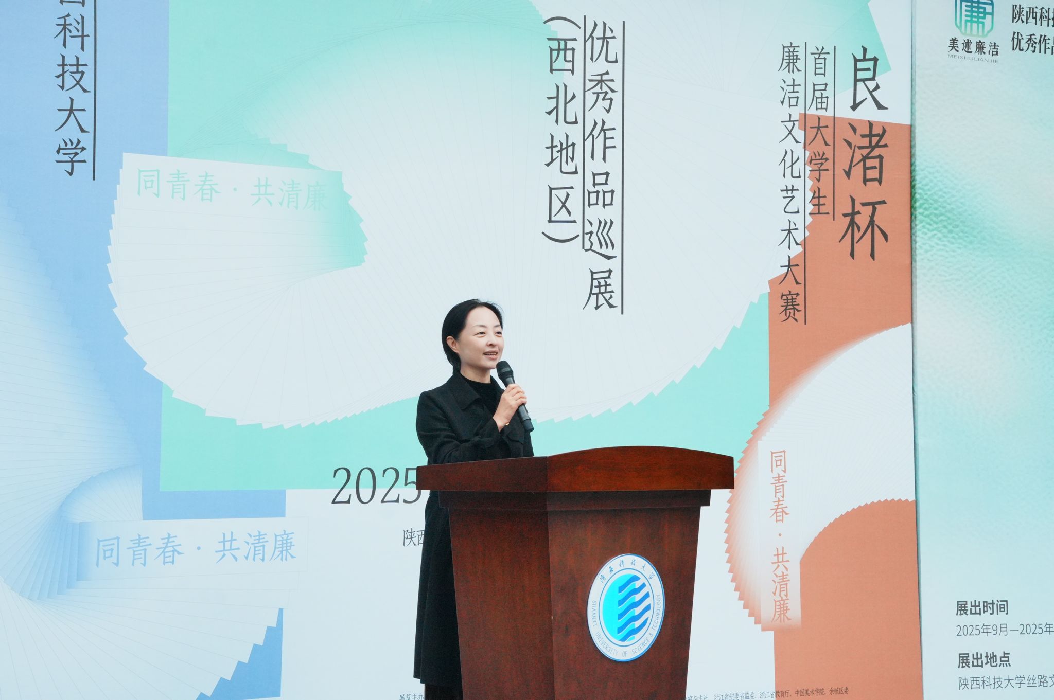 羅瑩在致辭中簡要介紹了我校認(rèn)真落實(shí)省委關(guān)于清廉陜西建設(shè)的部署要求,扎實(shí)推進(jìn)“清廉科大”建設(shè)的情況,指出“良渚杯”首屆全國大學(xué)生廉潔文化藝術(shù)大賽是加強(qiáng)新時(shí)代廉潔文化建設(shè)的生動(dòng)實(shí)踐,搭建了全國大學(xué)生廉潔文化創(chuàng)作交流展示的平臺(tái),此次西北地區(qū)巡展為我校校園文化建設(shè)注入了精神給養(yǎng)和清廉之風(fēng)。對展出期間的工作作出部署,希望通過本次雙展聯(lián)辦,深化與中國美術(shù)學(xué)院在廉潔文化建設(shè)方面的合作,也期待與陜西的兄弟高校、乃至西北地區(qū)高校加強(qiáng)交流,教育引導(dǎo)高校教職工、青年學(xué)子在清廉自守中正心修身、砥礪品格,推動(dòng)黨風(fēng)政風(fēng)、教風(fēng)學(xué)風(fēng)、師德師風(fēng)持續(xù)向好,為學(xué)校事業(yè)高質(zhì)量發(fā)展?fàn)I造風(fēng)清氣正的校園環(huán)境。