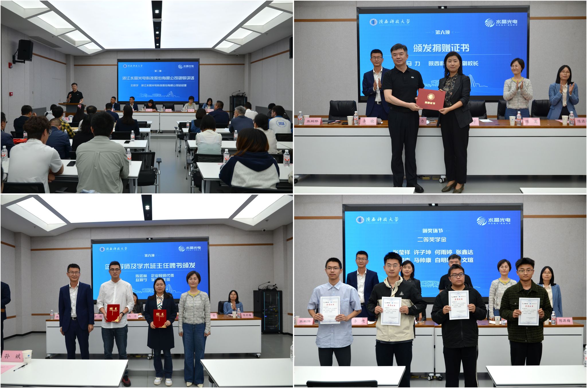 9月26日,陜西科技大學(xué)物理學(xué)院隆重舉行“水晶光電”獎(jiǎng)學(xué)金頒獎(jiǎng)暨產(chǎn)教融合“水晶班”開(kāi)班及儀器捐贈(zèng)儀式。副校長(zhǎng)馬力、水晶光電總經(jīng)理王震宇出席活動(dòng),校企雙方相關(guān)部門(mén)負(fù)責(zé)人、物理學(xué)院班子成員、獲獎(jiǎng)學(xué)生、“水晶班”全體學(xué)生及師生代表共110余人參加。儀式由物理學(xué)院院長(zhǎng)張鵬偉主持。