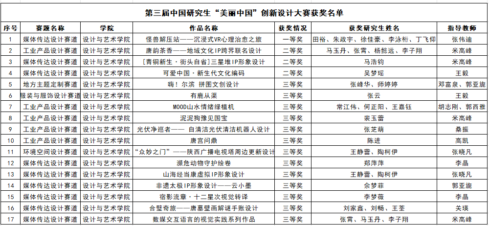 近日,由教育部學(xué)位與研究生教育司指導(dǎo),中國學(xué)位與研究生教育學(xué)會(huì)、中國科協(xié)青少年科技中心主辦的第三屆中國研究生“美麗中國”創(chuàng)新設(shè)計(jì)大賽全國總決賽在黑龍江大學(xué)舉行。經(jīng)激烈角逐,我校研究生團(tuán)隊(duì)斬獲國家級(jí)獎(jiǎng)項(xiàng)17項(xiàng),其中,一等獎(jiǎng)1項(xiàng)、二等獎(jiǎng)3項(xiàng)、三等獎(jiǎng)13項(xiàng),1名教師獲優(yōu)秀指導(dǎo)教師。獲獎(jiǎng)數(shù)量與質(zhì)量均刷新我校參賽紀(jì)錄,創(chuàng)下該賽事全國總決賽歷史最佳成績。