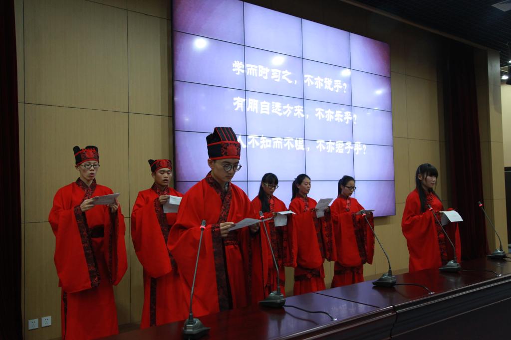 報告結束后,身著紅色漢服的國學社成員帶著峨冠博帶的赫赫威儀、云佩霓裳的翩翩神采,顯得端莊而又高雅。他們以古語特有的節(jié)奏與韻律,帶來論語經(jīng)典誦讀與解析,蘊含哲理的先賢之言隨著緩慢而清晰的語言碰撞著聽者的心靈。隨后是由圖書館趙冰老師領讀論語中的精彩語句,“學而時習之,不亦說乎,有朋自遠方來,不亦樂乎,人不知而不慍,不亦君子乎?”、“君子食無求飽,居無求安,敏于事而慎于言,就有道而正焉,可謂好學也矣。”……厚重的誦讀聲在報告廳中久久回蕩。