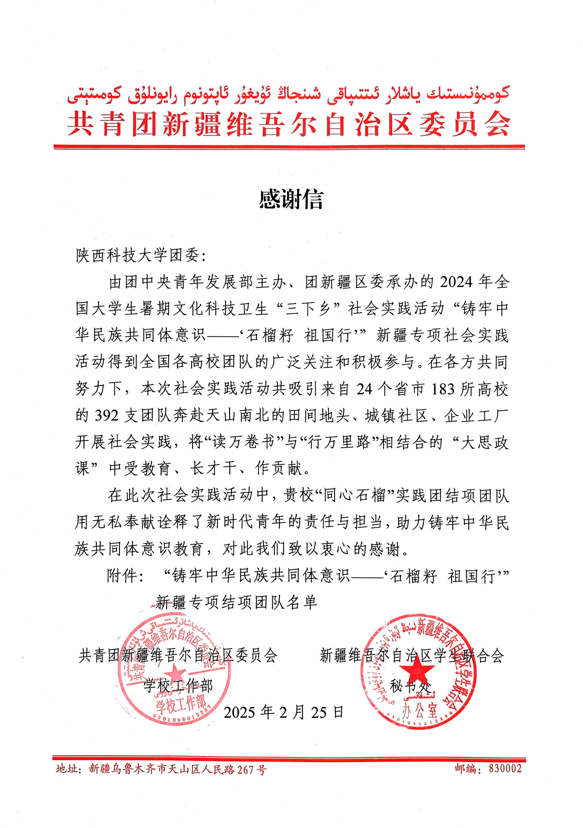 共青團(tuán)新疆維吾爾自治區(qū)委員會(huì)向我校團(tuán)委發(fā)來感謝信