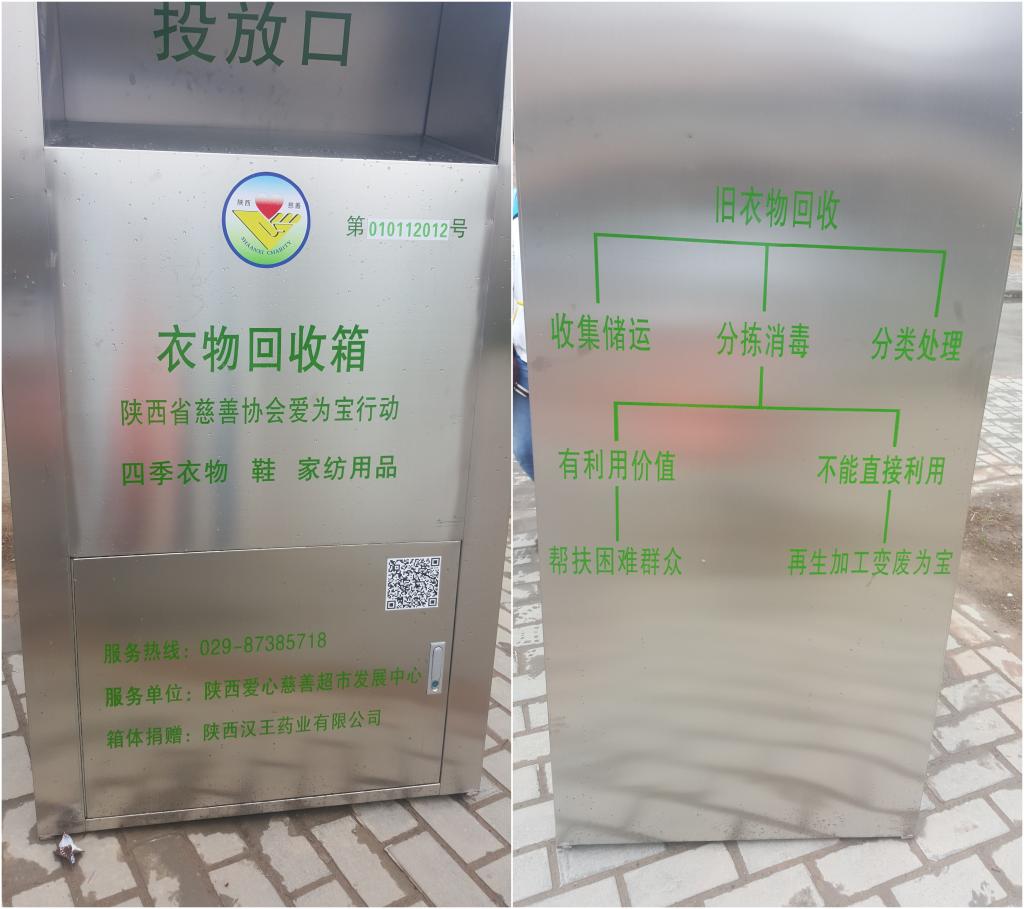 記者在現(xiàn)場(chǎng)看到,這些回收箱正中間是衣物投放口,一側(cè)印著醒目的綠字“保護(hù)環(huán)境,減少垃圾,節(jié)約資源,綠色低碳,扶貧濟(jì)困,奉獻(xiàn)愛(ài)心”,一側(cè)用同樣的綠字說(shuō)明了舊衣物回收的流程:舊衣物回收后,將進(jìn)行收集儲(chǔ)運(yùn)、分揀消毒、分類(lèi)處理后再通過(guò)其對(duì)應(yīng)的利用價(jià)值來(lái)再生加工。整個(gè)箱子在傳遞愛(ài)心的同時(shí),也在提醒我們綠色環(huán)保,人人有責(zé)。