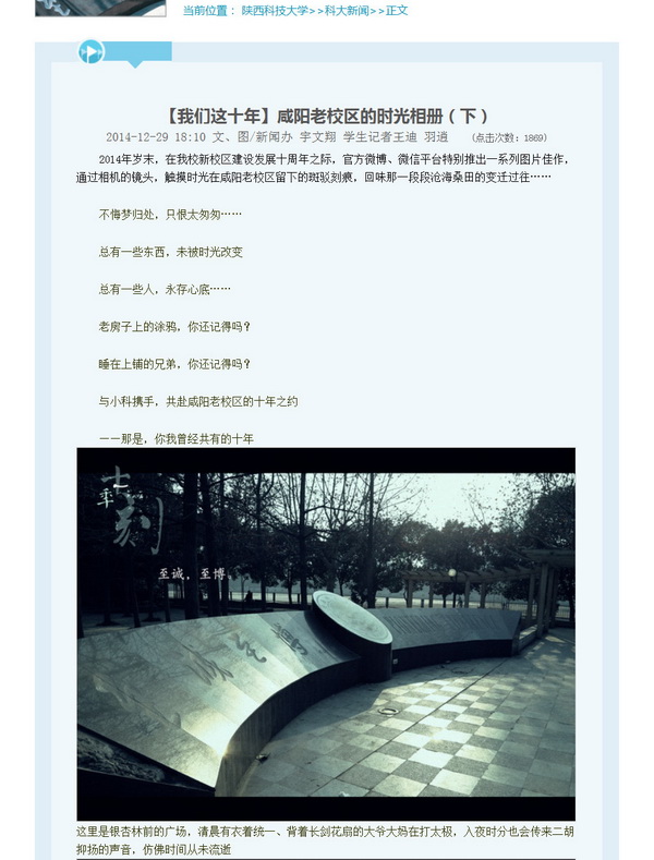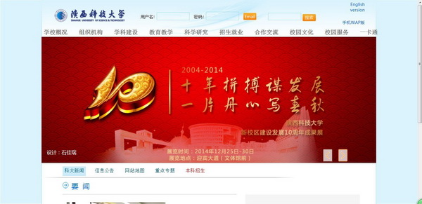 2014年是我校新校區(qū)建設(shè)十周年。12月25日起,我校開(kāi)展了紀(jì)念新校區(qū)建設(shè)發(fā)展十周年為主題的一系列活動(dòng),通過(guò)大型主題圖片展覽,系列專題報(bào)道,電視紀(jì)實(shí)片、專題片,校報(bào)??旅襟w專題推送,廣播等形式,講好科大好故事,傳播好科大聲音,進(jìn)行校史校情教育,全面反映學(xué)校十年來(lái)建設(shè)發(fā)展的奮斗與輝煌,激發(fā)師生的愛(ài)國(guó)愛(ài)校感情。該系列紀(jì)念活動(dòng)生動(dòng)準(zhǔn)確地傳播了以團(tuán)結(jié)奮進(jìn)、拼搏進(jìn)取為核心的新校區(qū)建設(shè)的優(yōu)良傳統(tǒng)和工作作風(fēng),形成了宣傳輿論聲勢(shì),振奮了師生精神,在科大內(nèi)外反響強(qiáng)烈。