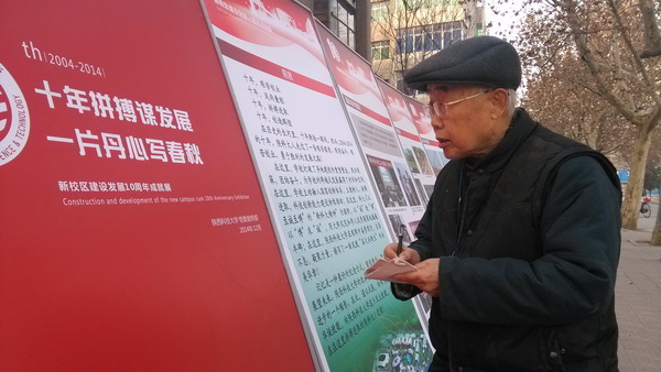 2014年12月25日至2015年1月4日,“十年拼搏謀發(fā)展 一片丹心寫春秋——新校區(qū)建設(shè)發(fā)展10周年成就展”先后在西安校區(qū)迎賓大道和咸陽(yáng)校區(qū)舉行。展覽凸顯“異地建設(shè)速度快,以人為本建住宅,五年清償銀行債”的新校區(qū)建設(shè)三大特點(diǎn),通過(guò)基本條件建設(shè)、人才培養(yǎng)、學(xué)科建設(shè)與研究生教育、科研成果、校園文化、對(duì)外交流和黨的建設(shè)7大板塊43塊展板,充分展示了學(xué)校主體東移的艱苦創(chuàng)業(yè)和改革發(fā)展的輝煌成就。展覽期間,包括廣大師生員工和離退休老同志在內(nèi)的觀展者絡(luò)繹不絕,機(jī)關(guān)黨委、保障黨委、基建處、材料科學(xué)與工程學(xué)院等單位還組織進(jìn)行了集體參觀。大家在展板前憶往昔、嘆變化,心潮澎湃,感慨萬(wàn)千,還有人拿起筆記本詳細(xì)記錄,甚至有人流下了激動(dòng)的淚水。