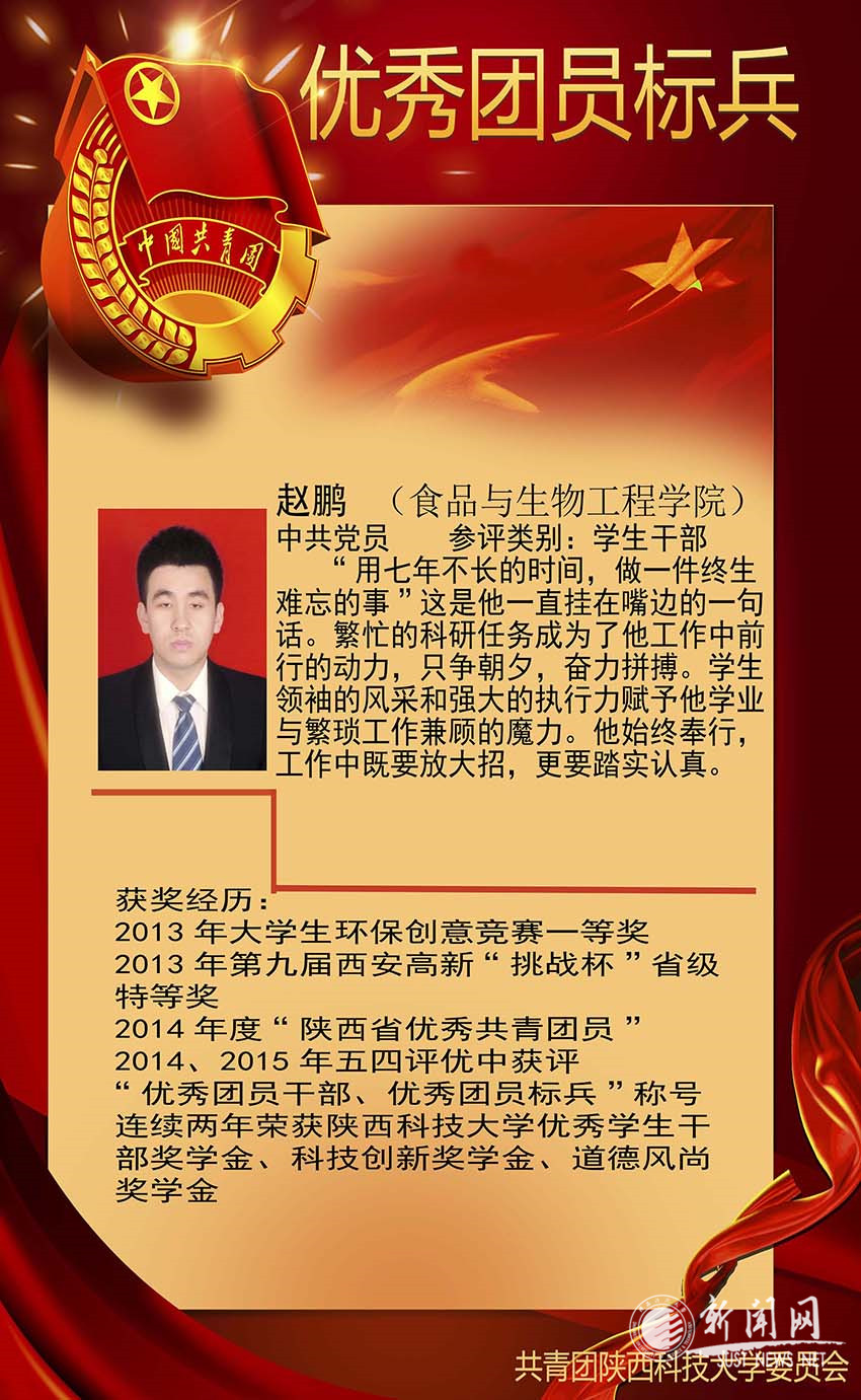 趙鵬,中共黨員,中藥學(xué)碩士在讀。本科就讀于陜西科技大學(xué)食品與生物工程學(xué)院藥物制劑專業(yè),曾任校學(xué)生會主席、省學(xué)聯(lián)社工部部長、院學(xué)生會主席、紅螞蟻協(xié)會會長、輔導(dǎo)員助理、新生班主任助理。現(xiàn)任食品學(xué)院團(tuán)委副書記(學(xué)生)、校團(tuán)委部長助理、學(xué)生制藥專業(yè)(本科)黨支部書記,負(fù)責(zé)指導(dǎo)學(xué)院團(tuán)屬學(xué)生組織工作,以及協(xié)助負(fù)責(zé)學(xué)校志愿服務(wù)工作,是一名的優(yōu)秀共青團(tuán)干部。