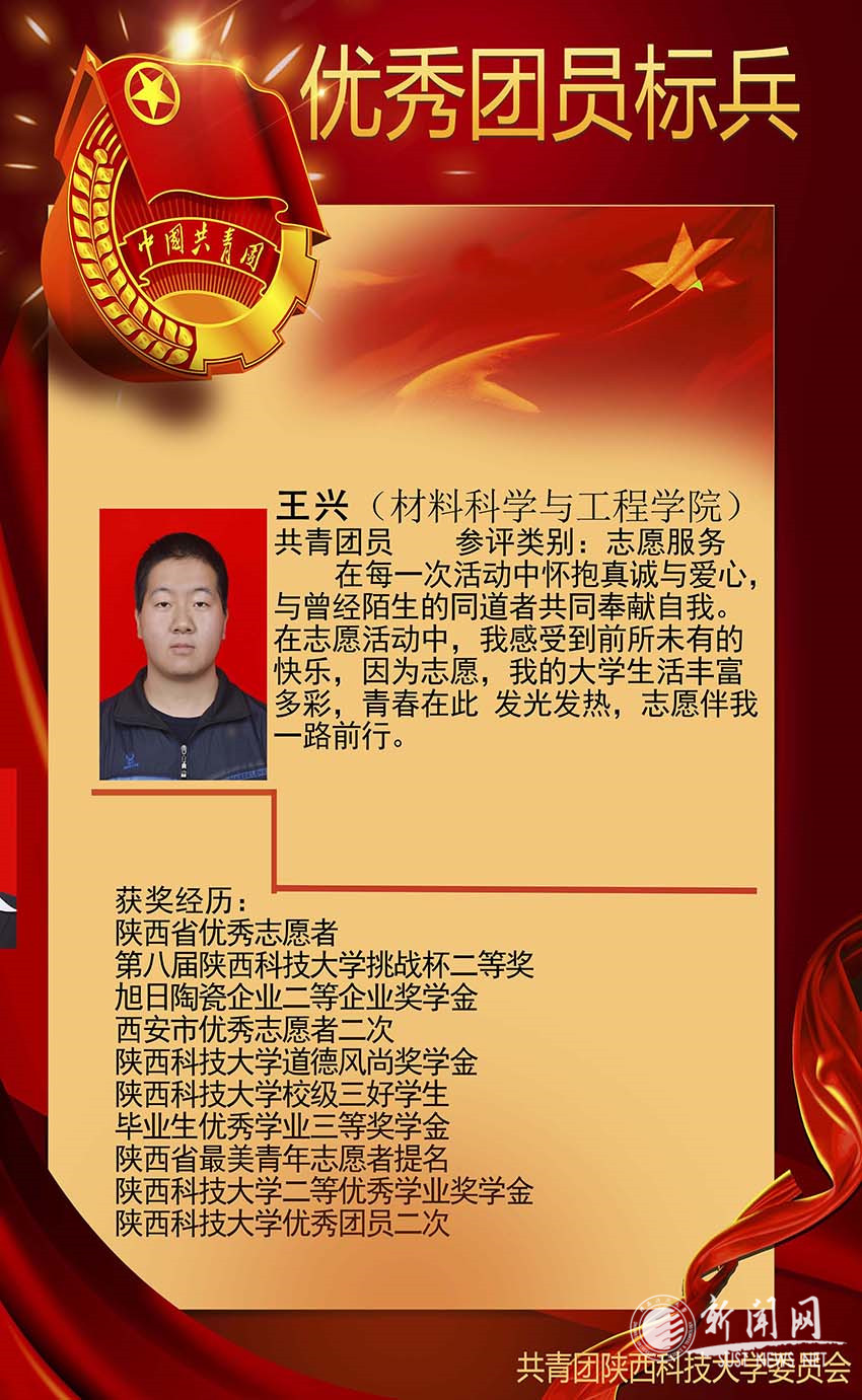 王興,共青團(tuán)員,陜西科技大學(xué)材料學(xué)院材料化學(xué)專業(yè)2012級學(xué)生。自入校以來,他積極進(jìn)取、自立自強(qiáng)、成長成才、感恩奉獻(xiàn),在學(xué)習(xí)和志愿服務(wù)方面都取得了良好的成績。