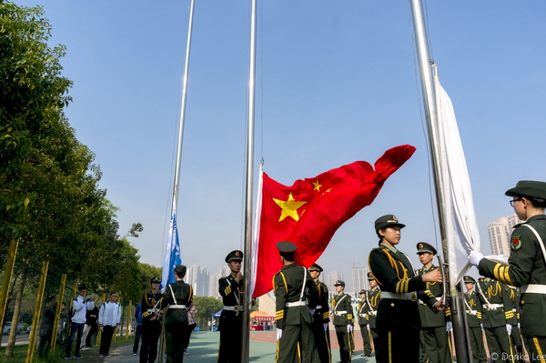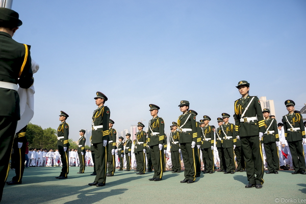 熱浪席卷運(yùn)動(dòng)會(huì)賽場(chǎng),所到陰涼之處盡是人群,唯有一支來(lái)自我校的國(guó)旗護(hù)衛(wèi)隊(duì),由32名隊(duì)員組成的他們,無(wú)人缺席。他們一一身著整齊的制服,將自己昂首挺胸的身姿立于烈日之下。