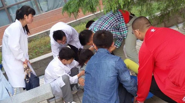 4月23日上午10點(diǎn)多鐘,1號(hào)教學(xué)樓F座樓前上演驚心一幕:一名資源與環(huán)境學(xué)院的女生不慎從石凳上摔下,頭部直接觸地,當(dāng)時(shí)就發(fā)生了抽搐,所幸是得到路人通知的醫(yī)療救護(hù)隊(duì)立即趕到,對(duì)她進(jìn)行了及時(shí)的救護(hù)。