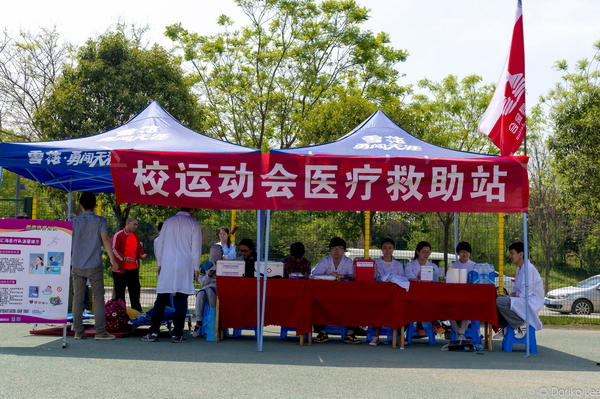 處理完這些之后,幾名醫(yī)護(hù)人員又趕回了熱鬧的運(yùn)動(dòng)場(chǎng),這里有一個(gè)藍(lán)色的帳篷,里面配備有氧氣袋、擔(dān)架和醫(yī)療救助箱等救援器材,隨時(shí)準(zhǔn)備救助賽場(chǎng)上受傷的運(yùn)動(dòng)員和觀眾。這是由校醫(yī)院和匯?;饡?huì)聯(lián)合成立的一支醫(yī)療救助隊(duì),除了一名醫(yī)生和一名護(hù)士,其余的15個(gè)人都是匯?;饡?huì)的大學(xué)生志愿者。從去年開(kāi)始,他們就成為運(yùn)動(dòng)會(huì)的駐場(chǎng)組織,還會(huì)不定期派人在賽場(chǎng)上巡邏,以便及時(shí)為師生們提供醫(yī)療救助服務(wù)。