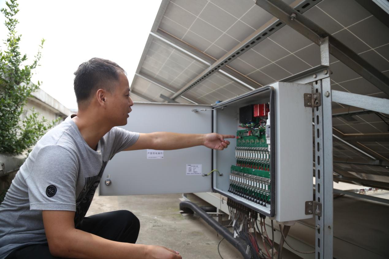 太陽(yáng)能發(fā)電板的背后裝有光伏陣列匯流箱,一個(gè)樓頂?shù)陌l(fā)電板配備2個(gè)這樣的裝置。巡查過(guò)程中,種馬剛必須打開(kāi)這個(gè)箱子,通過(guò)里面的數(shù)碼管顯示器,查看每一路光伏電池組串的電流、電壓和溫度情況,據(jù)此確定設(shè)備是否正常運(yùn)轉(zhuǎn)。