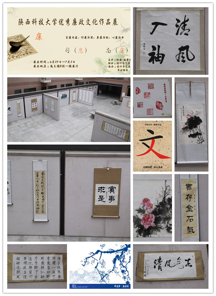 由紀(jì)委、監(jiān)察處主辦,設(shè)計(jì)與藝術(shù)學(xué)院協(xié)辦,設(shè)藝學(xué)院學(xué)生會(huì)、書法協(xié)會(huì)承辦的優(yōu)秀廉政文化作品展6月29日至7月3日在逸夫樓B段一樓展廳展出。