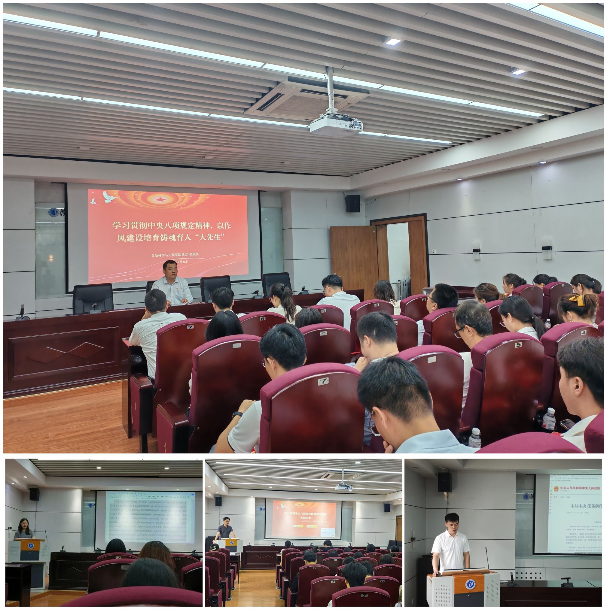 七一前夕,學(xué)院領(lǐng)導(dǎo)班子和各師生黨支部書記分別講授深入貫徹中央八項(xiàng)規(guī)定精神學(xué)習(xí)教育專題黨課。學(xué)院黨委書記張凱凱以《深入學(xué)習(xí)貫徹中央八項(xiàng)規(guī)定精神,以作風(fēng)建設(shè)培育鑄魂育人“大先生”》為題進(jìn)行授課,系統(tǒng)闡釋了教育領(lǐng)域踐行中央八項(xiàng)規(guī)定精神的重要意義。學(xué)院黨委委員、各師生黨支部書記圍繞深入貫徹中央八項(xiàng)規(guī)定精神學(xué)習(xí)教育心得體會,結(jié)合分管領(lǐng)域工作及支部特點(diǎn)講授專題黨課,持續(xù)推動中央八項(xiàng)規(guī)定精神在食品學(xué)院落地見效.