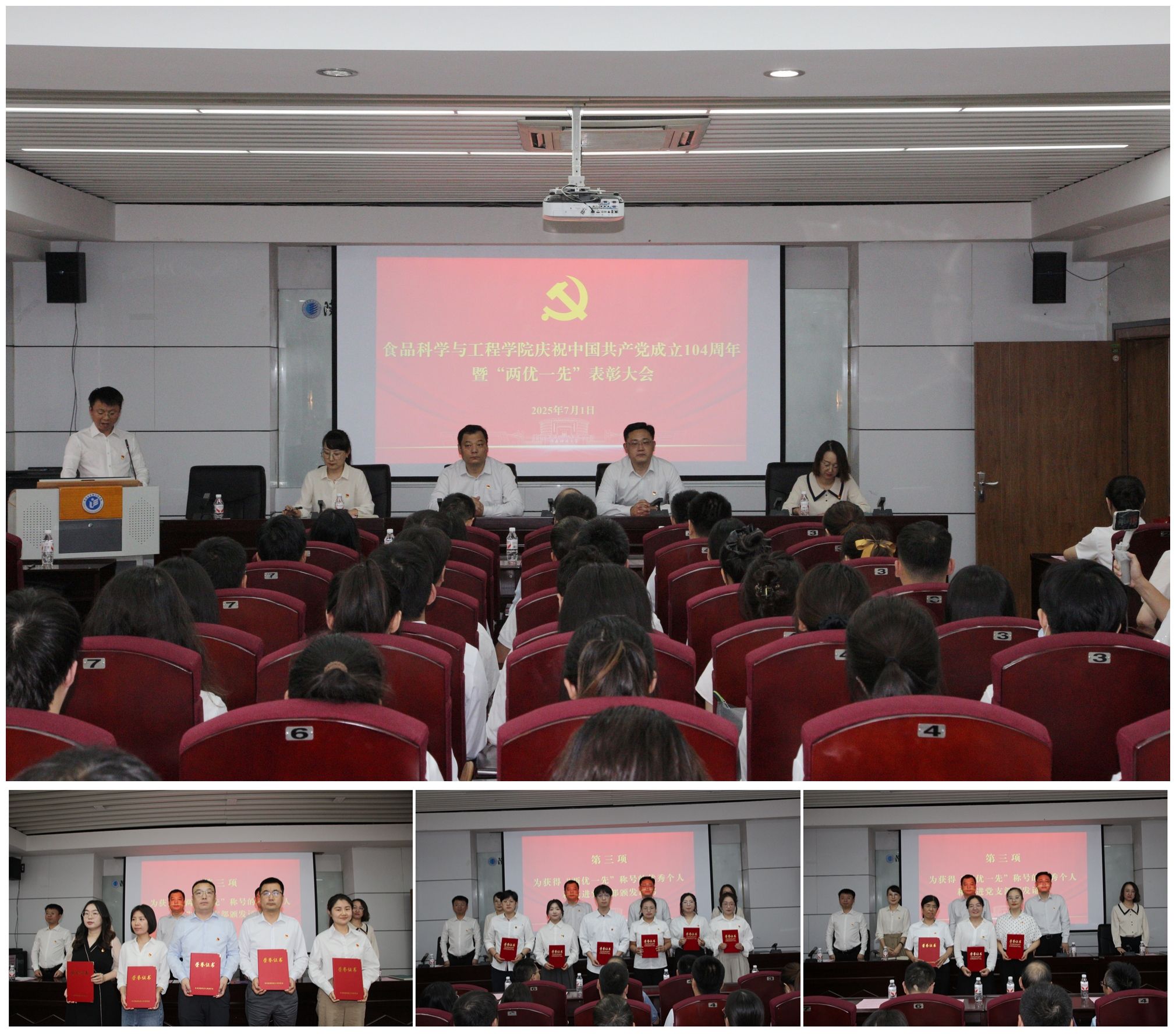 7月1日,學(xué)院召開慶祝中國共產(chǎn)黨成立104周年暨“兩優(yōu)一先”表彰大會,對劉江花等優(yōu)秀共產(chǎn)黨員、優(yōu)秀黨務(wù)工作者以及先進(jìn)黨支部代表頒獎(jiǎng),大會號召全體黨員,以習(xí)近平新時(shí)代中國特色社會主義思想為指導(dǎo),聚焦教育教學(xué)各項(xiàng)工作,以昂揚(yáng)的斗志、務(wù)實(shí)的作風(fēng),充分發(fā)揮黨支部的戰(zhàn)斗堡壘作用和黨員的先鋒模范作用,凝聚全院師生的智慧與力量,為建成國內(nèi)一流學(xué)院和學(xué)校沖刺“雙一流”建設(shè)目標(biāo)貢獻(xiàn)更大“食品力量”。