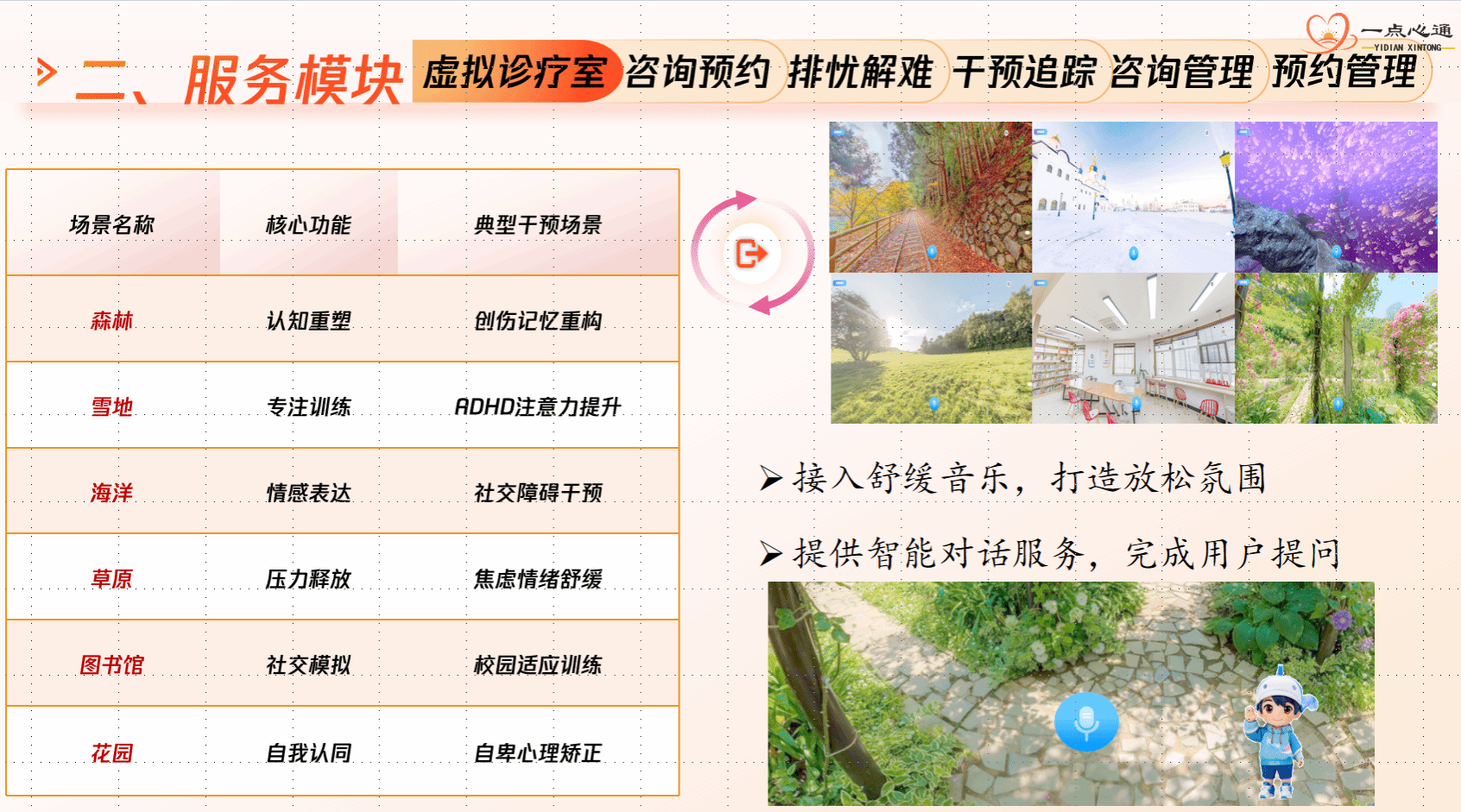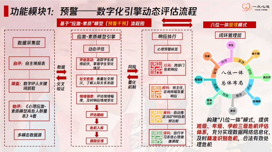 該平臺通過數(shù)智技術(shù)構(gòu)建了“預(yù)警-服務(wù)-教育”三級聯(lián)動機制,八大角色前后銜接,協(xié)同構(gòu)建心理健康教育模式閉環(huán)。在預(yù)警模塊,自主研發(fā)“心理危機篩查核心引擎”,首創(chuàng)心理“應(yīng)激-素質(zhì)”評估模型,結(jié)合多模態(tài)情緒數(shù)據(jù)監(jiān)測等技術(shù),實現(xiàn)心理問題分層預(yù)警及動態(tài)實時賦碼,解決鄉(xiāng)村心理問題學(xué)生篩不準(zhǔn)困境;在服務(wù)模塊,通過 AR現(xiàn)實增強技術(shù)創(chuàng)設(shè)6類3D心理干預(yù)場景,打造低成本“沉浸式移動心空間”,并搭建隱秘式“排憂解難”論壇,提供專業(yè)的心理問題疏導(dǎo)與咨詢服務(wù),解決心理問題干預(yù)方式低數(shù)字困境;在教育模塊,利用人工智能技術(shù)打造 IP 心理學(xué)伴,集成自然語言處理(NLP)技術(shù)等自動觸發(fā)學(xué)伴的主動關(guān)懷機制,同時攜手心理專家研發(fā)特色網(wǎng)絡(luò)課程,通過開發(fā)項目式課程、案例式課程、游戲式課程,解決心理健康教育缺師資困境,實現(xiàn)心理問題從精準(zhǔn)預(yù)警到科學(xué)干預(yù)、從教育培訓(xùn)到心理素養(yǎng)提升的全流程服務(wù)。“一點心通”數(shù)字化教育平臺以中小學(xué)生為核心服務(wù)群體,通過教師、家長、班主任、德育主任詢師及教育行政部門等八位一體布局,共同擴(kuò)大“一點心通”平臺使用范圍,形成中小學(xué)心理健康服務(wù)體系。