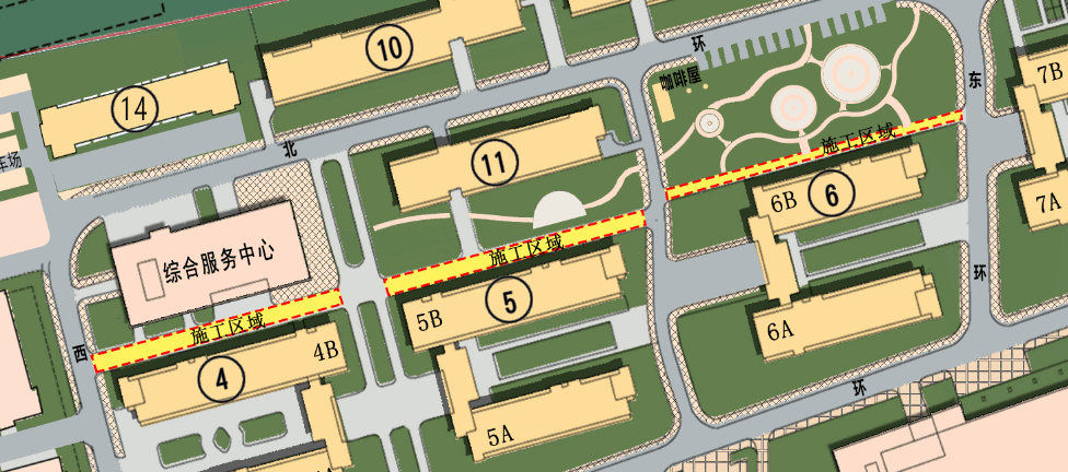 關(guān)于對學(xué)生生活區(qū)綜合服務(wù)中心南側(cè)等三處道路封閉施工的通知