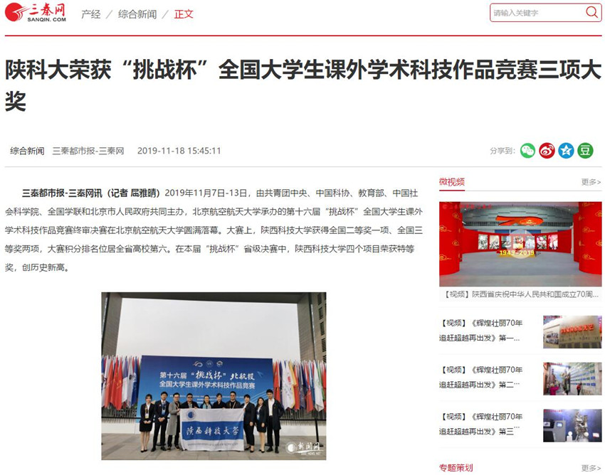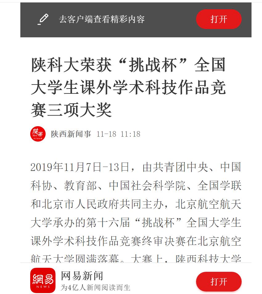 網(wǎng)易新聞:陜科大榮獲“挑戰(zhàn)杯”全國大學生課外學術(shù)科技作品競賽三項大獎