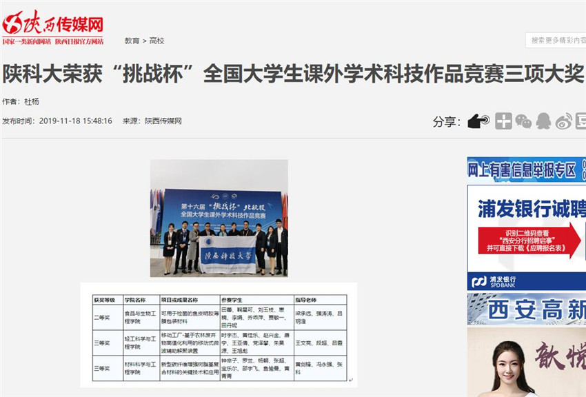 人民日報APP:陜科大榮獲“挑戰(zhàn)杯”全國大學生課外學術(shù)科技作品競賽三項大獎