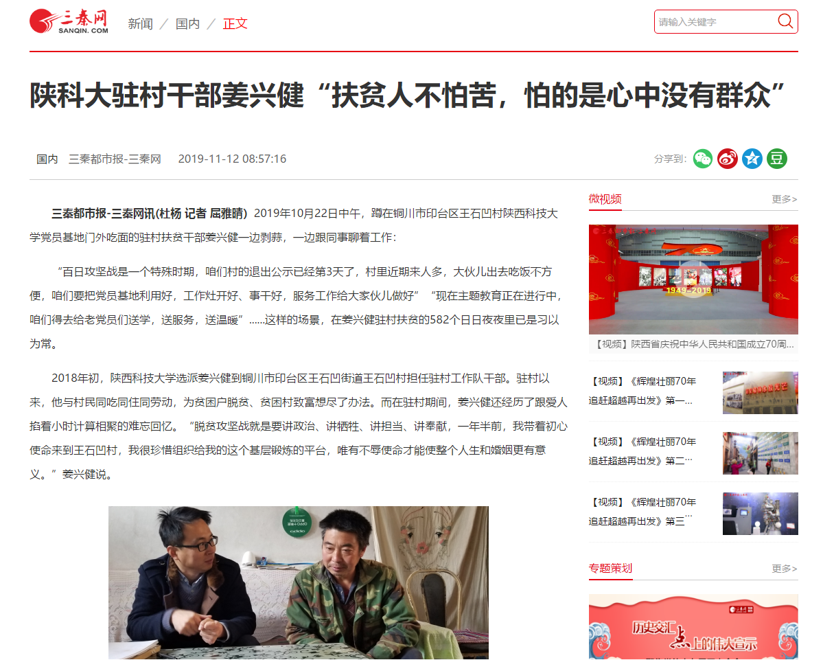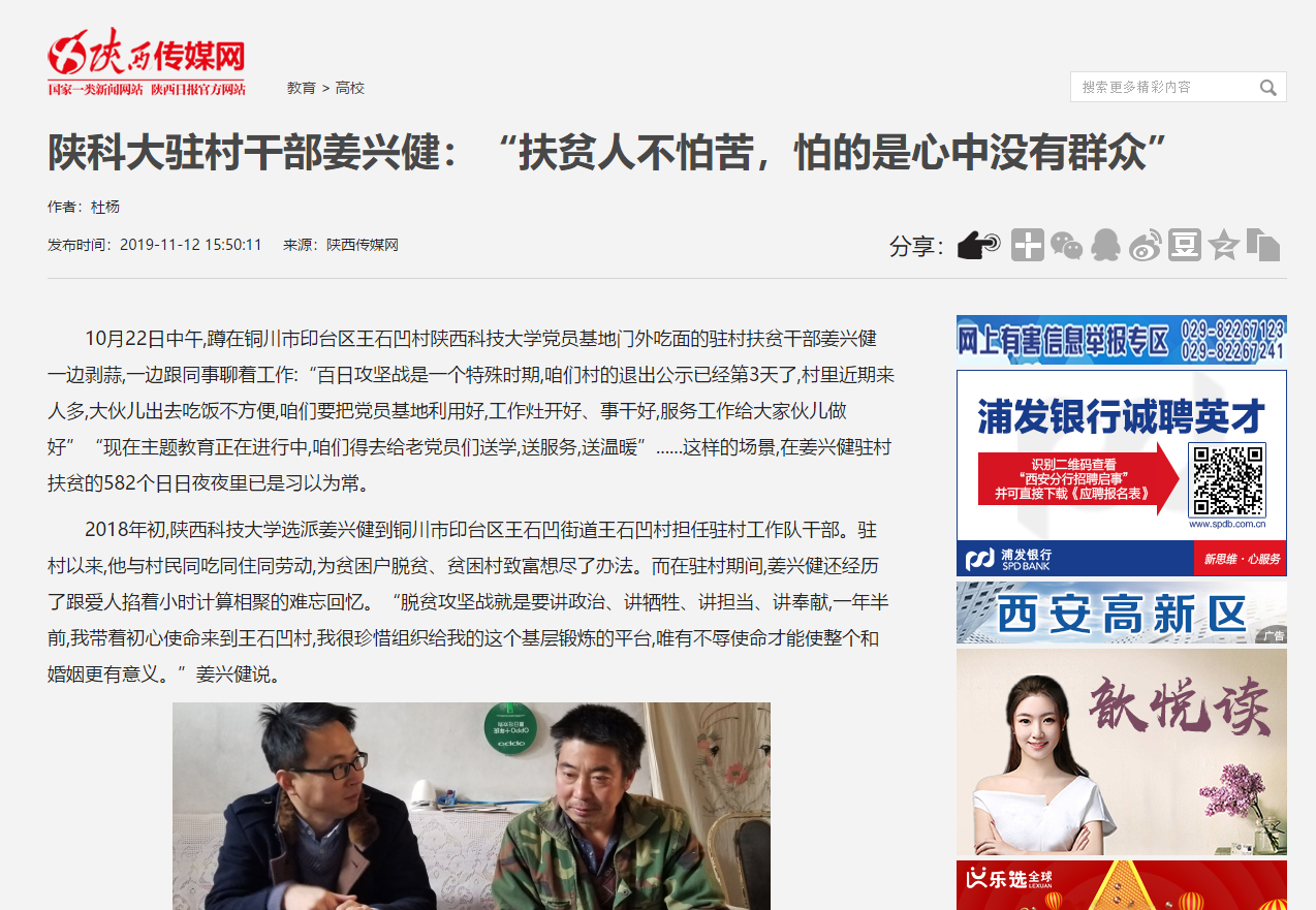11月21日,《陜西日報》以不辱使命才能使人生更有意義--記陜科大駐村干部姜興健為題,報道了我校駐村干部姜興健駐村扶貧事跡,鏈接如下:陜西日報:不辱使命才能使人生更有意義——記陜科大駐村干部姜興健