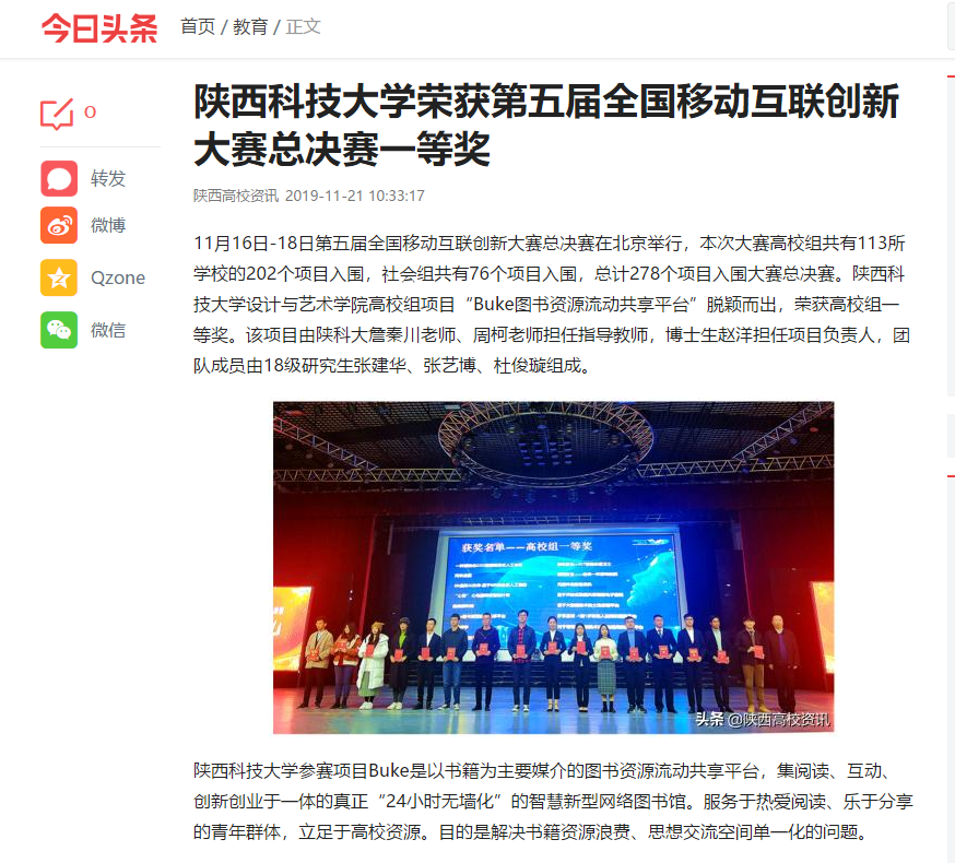 今日頭條App報道:陜西科技大學(xué)榮獲第五屆全國移動互聯(lián)創(chuàng)新大賽總決賽一等獎