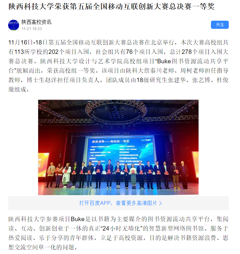 百度APP報道:陜西科技大學(xué)榮獲第五屆全國移動互聯(lián)創(chuàng)新大賽總決賽一等獎