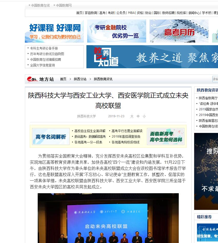 近日,中國(guó)青年網(wǎng)、中國(guó)教育網(wǎng)、搜狐網(wǎng)、今日頭條、百度APP、網(wǎng)易新聞、三秦網(wǎng)、陜西傳媒網(wǎng)等媒體紛紛報(bào)道我校與西安工大、西安醫(yī)學(xué)院成立未央高校聯(lián)盟。